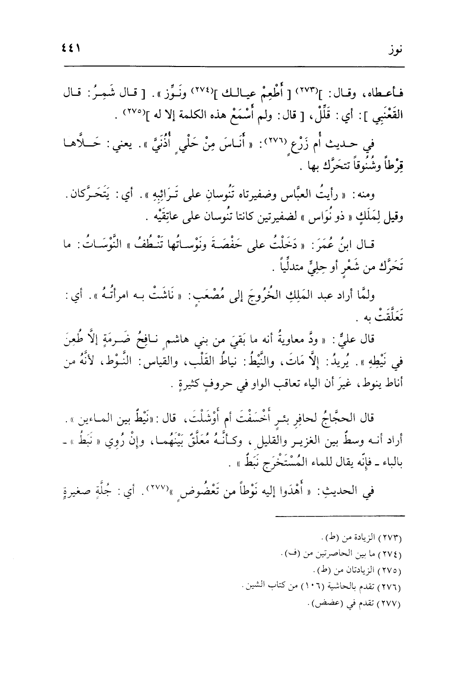 قَالَ ابْن عمر دخلت عَلَى حَفْصَة ونوساتها تنطف النوسات مَا تحرّك من شعر أَو حلي متدليا