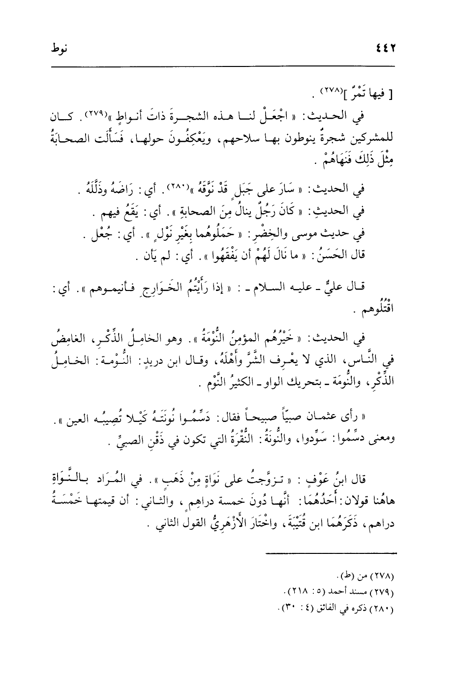 فِي الحَدِيث اجْعَل لنا هَذِه الشَّجَرَة ذَات أنواط كَانَ للْمُشْرِكين شَجَرَة ينوطون بهَا سِلَاحهمْ ويعكفون حولهَا فَسَأَلت الصَّحَابَة مثل ذَلِك فنهاهم