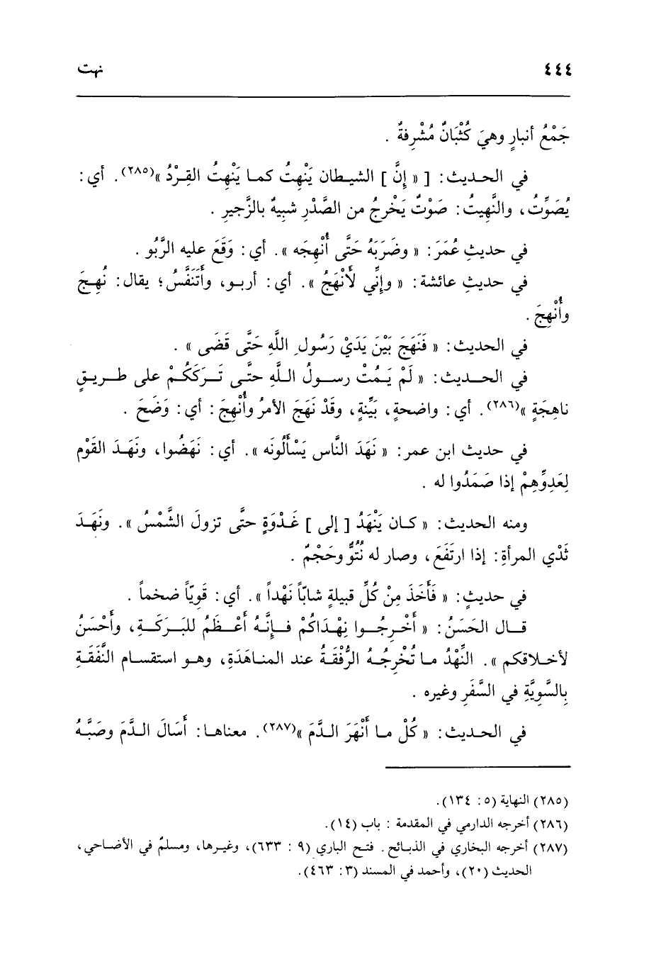 وَفِيه الحَدِيث كَانَ ينهد إِلَى غدْوَة حَتَّى تَزُول الشَّمْس ونهد ثدي الْمَرْأَة إِذا ارْتَفع وَصَارَ لَهُ نتو حجم