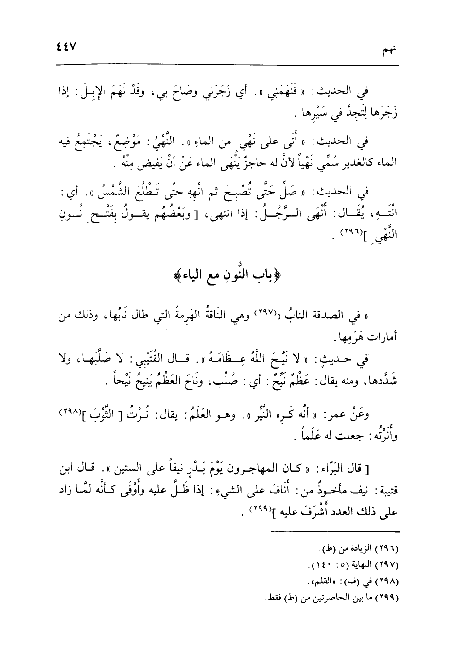 فِي الحَدِيث أَتَى عَلَى نهي من المَاء النَّهْي مَوضِع يجْتَمع فِيهِ المَاء كالغدير سمي نهيا لِأَن لَهُ حاجز ينْهَى المَاء عَن أَن يفِيض مِنْهُ