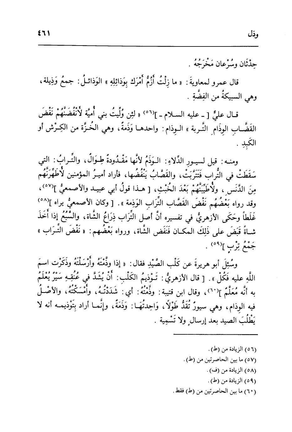 وَمِنْه قيل لسيور الدلاء الوذم لِأَنَّهَا مقدودة طوال وَالتُّرَاب الَّتِي سَقَطت فِي التُّرَاب فتتربت والقصاب ينفضها فَأَرَادَ أَمِير الْمُؤمنِينَ لأطهرنهم من الدنس ولأطيبنهم بعد الْخبث هَذَا قَول أبي عبيد والأصمعي وَقد رَوَاهُ بَعضهم نفض القصاب التُّرَاب الوذمة وَكَانَ الْأَصْمَعِي يرَاهُ غَلطا وَحَكَى الْأَزْهَرِي فِي تَفْسِيره أَن أصل التُّرَاب ذِرَاع الشَّاة والسبع إِذا أَخذ شَاة قبض عَلَى ذَلِك الْمَكَان فنفض الشَّاة وَرَوَاهُ بَعضهم نفض التُّرَاب جمع ترب وَسُئِلَ أَبُو هُرَيْرَة عَن كلب الصَّيْد فَقَالَ إِذا وذمته وأرسلته وَذكرت اسْم الله عَلَيْهِ فَكل قَالَ الْأَزْهَرِي توذيم الْكَلْب أَن يشد فِي عُنُقه سير يعلم بِهِ أَنه معلم وَقَالَ ابْن قُتَيْبَة وذمته أَي شددته وأمسكته وَالْأَصْل فِيهِ الوذام وَهِي سيور تقد طولا واحدتها وَذمَّة وَإِنَّمَا أَرَادَ بتوذيمه أَنه لَا يطْلب الصَّيْد بعد إرْسَال وَلَا تَسْمِيَة