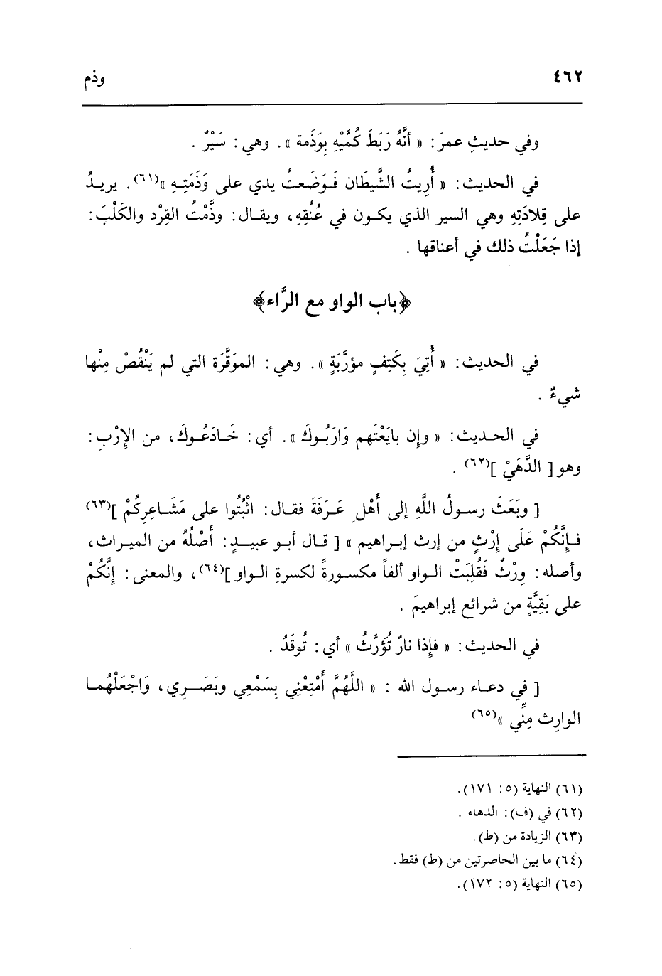 وَبعث رَسُول الله إِلَى أهل عَرَفَة فَقَالَ اثبتوا عَلَى مشاعركم فَإِنَّكُم عَلَى إِرْث من إِرْث إِبْرَاهِيم قَالَ أَبُو عبيد أَصله من الْمِيرَاث وَأَصله ورث فقلبت الْوَاو ألفا مَكْسُورَة لكسرة الْوَاو وَالْمعْنَى إِنَّكُم عَلَى بَقِيَّة من شرائع إِبْرَاهِيم