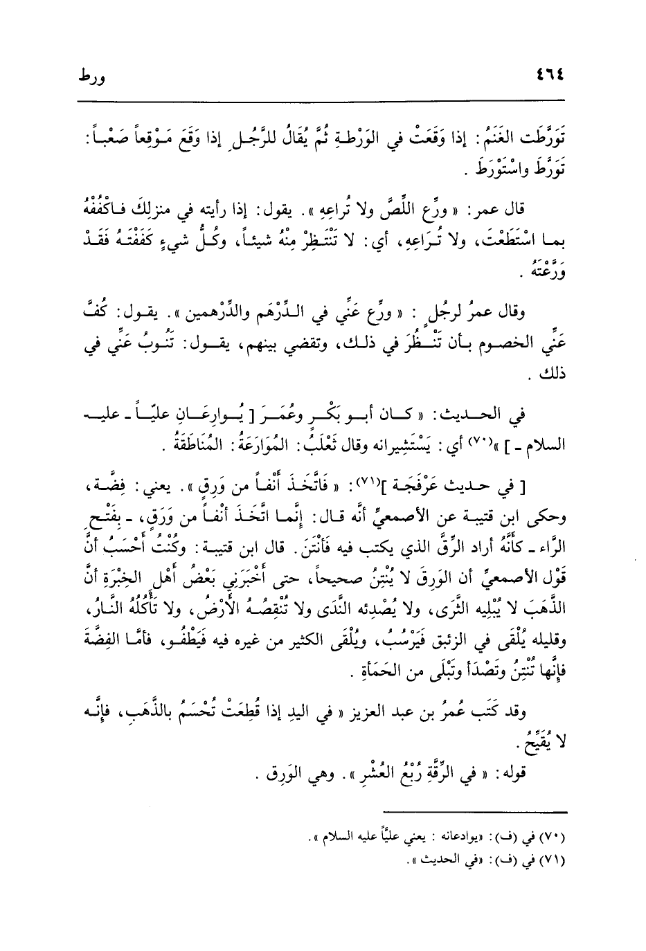 فِي حَدِيث عرْفجَة فَاتخذ أنفًا من ورق يَعْنِي فضَّة وَحَكَى ابْن قُتَيْبَة عَن الْأَصْمَعِي أَنه قَالَ إِنَّمَا اتخذ أنفًا من ورق بِفَتْح الرَّاء كَأَنَّهُ أَرَادَ الرّقّ الَّذِي يكْتب فِيهِ فَأَنْتن قَالَ ابْن قُتَيْبَة وَكنت أَحسب أَن قَول الْأَصْمَعِي أَن الْوَرق لَا ينتن صَحِيحا حَتَّى أَخْبرنِي بعض أهل الْخِبْرَة أَن الذَّهَب لَا يبليه الثرى وَلَا يصدئه الندى وَلَا تنقصه الأَرْض وَلَا تَأْكُله النَّار وقليله يلقى فِي الزئبق فيرسب ويلقى الْكثير من غَيره فِيهِ فيطفو فَأَما الْفضة فَإِنَّهَا تنتن وتصدأ وتبلى من الحماة