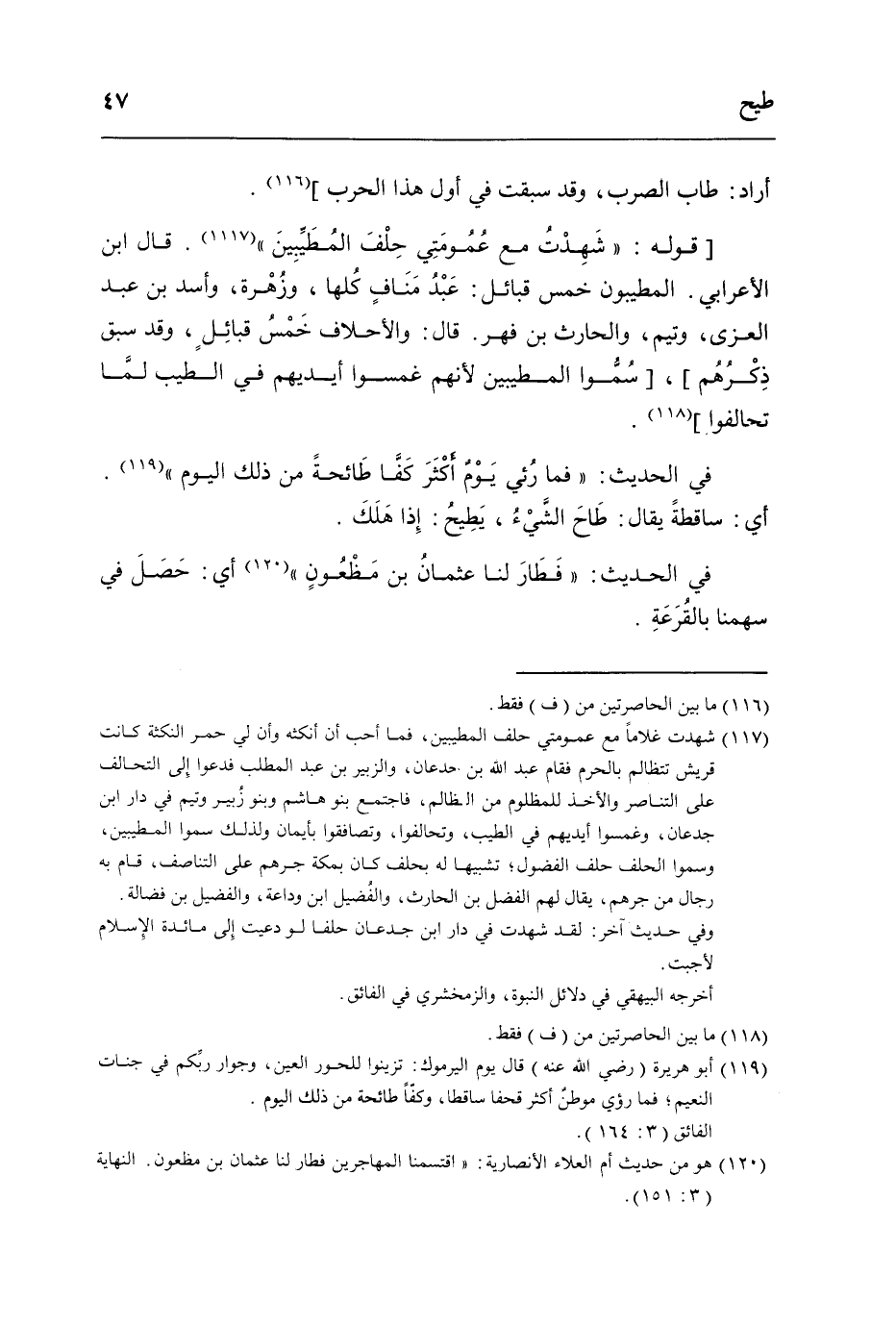 قَوْله شهِدت مَعَ عمومتي حلف المطيبين قَالَ ابْن الْأَعرَابِي المطيبون خمس قبائل عبد منَاف كلهَا وزهرة وَأسد بن عبد الْعُزَّى وتيم والْحَارث بن فهر قَالَ والأحلاف خمس قبائل وَقد سبق ذكرهم سموا المطيبين لأَنهم غمسوا أَيْديهم فِي الطّيب لما تحالفوا