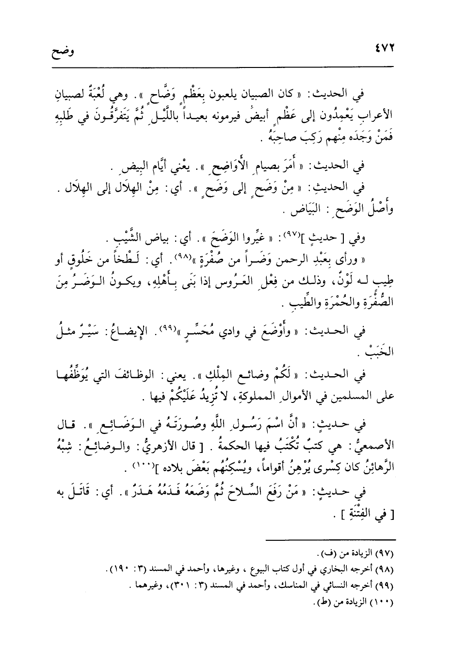 فِي الحَدِيث كَانَ الصّبيان يَلْعَبُونَ بِعظم وضاح وَهِي لعبة لصبيان الْأَعْرَاب يَعْمِدُونَ إِلَى عظم أَبيض فيرمونه بَعيدا بِاللَّيْلِ ثمَّ يتفرقون فِي طلبه فَمن وجده مِنْهُم ركب صَاحبه