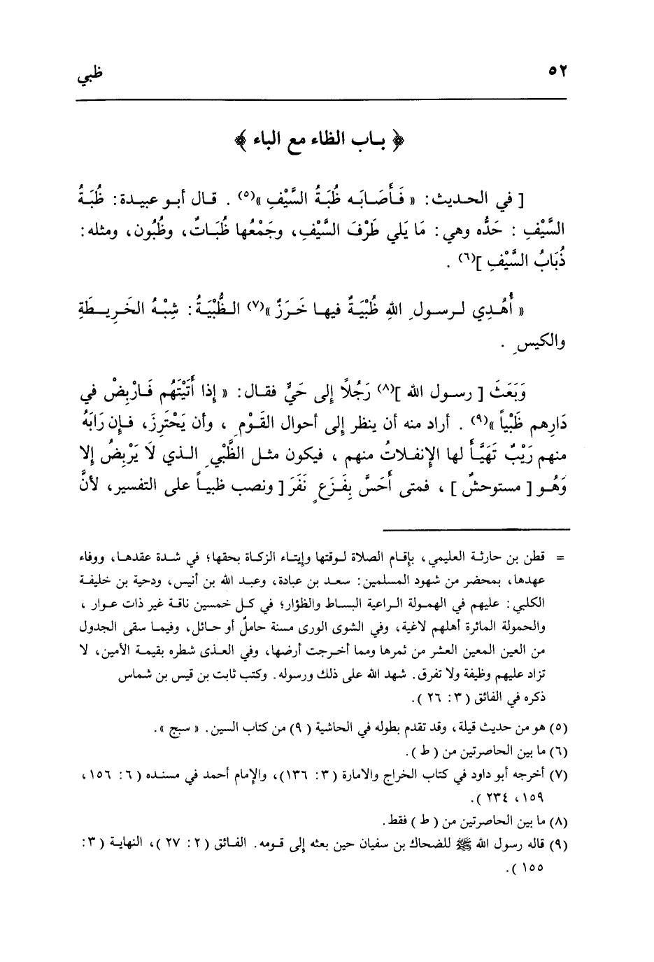 فِي الحَدِيث فَأَصَابَهُ ظبة السَّيْف قَالَ أَبُو عُبَيْدَة ظبة السَّيْف حَده وَهِي مَا يَلِي طرف السَّيْف وَجَمعهَا ظبات وظبون وَمثله ذُبَاب السَّيْف