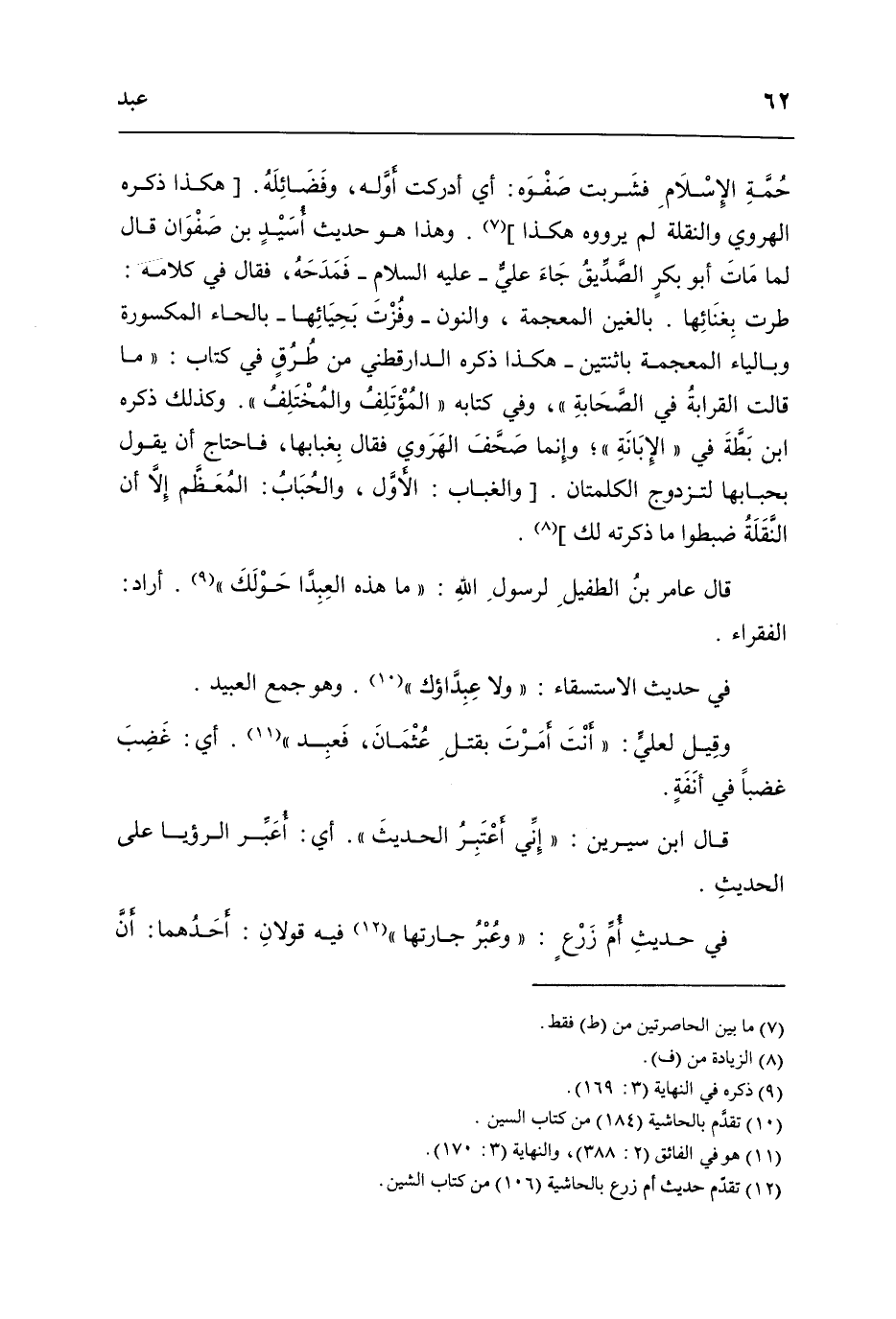 حمة الْإِسْلَام فَشَرِبت صَفوه أَي أدْركْت أَوله وفضائله هَكَذَا ذكره الْهَرَوِيّ والنقلة لم يرووه هَكَذَا وَهَذَا هُوَ حَدِيث أسيد بن صَفْوَان قَالَ لما مَاتَ أَبُو بكر الصّديق جَاءَ عَلّي عَلَيْهِ السَّلَام فمدحه فَقَالَ فِي كَلَامه طرت بغنائها بالغين الْمُعْجَمَة وَالنُّون وفزت بحيائها بِالْحَاء الْمَكْسُورَة وبالياء الْمُعْجَمَة بِاثْنَتَيْنِ هَكَذَا ذكره الدَّارَقُطْنِيّ من طرق فِي كتاب مَا قَالَت الْقَرَابَة فِي الصَّحَابَة وَفِي كِتَابه المؤتلف والمختلف وَكَذَلِكَ ذكره ابْن بطة فِي الْإِبَانَة وَإِنَّمَا صحف الْهَرَوِيّ فَقَالَ بغبابها فَاحْتَاجَ أَن يَقُول بحبابها لتزدوج الكلمتان والغباب الأول والحباب الْمُعظم إِلَّا أَن النقلَة ضبطوا مَا ذكرته لَك