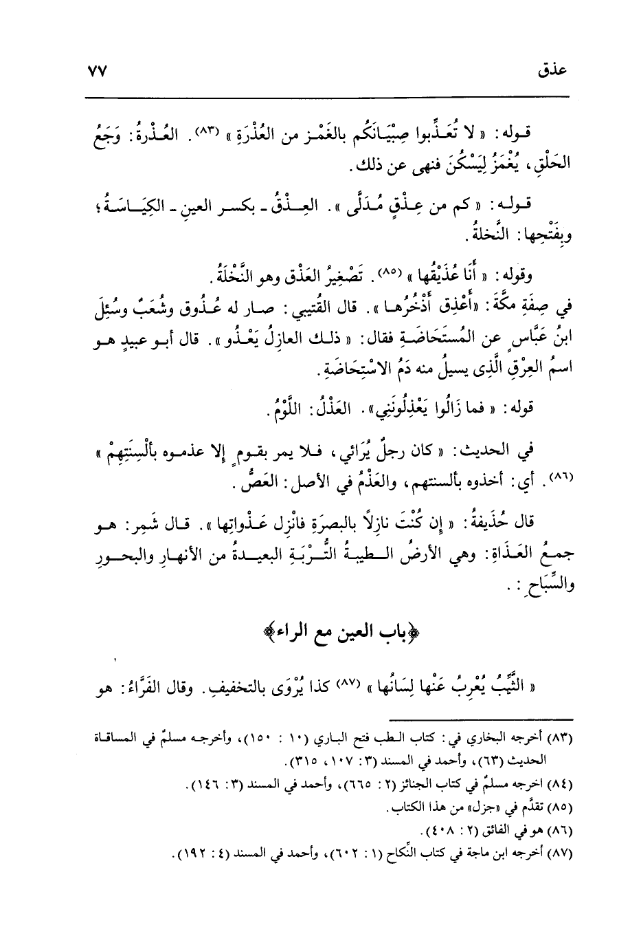 قَوْله كم من عذق مدلى العذق بِكَسْر الْعين الكياسة وَبِفَتْحِهَا النَّخْلَة وَقَوله أَنا عذيقها تَصْغِير العذق وَهُوَ النَّخْلَة فِي صفة مَكَّة أعذق أذخرها قَالَ القتيبي صَار لَهُ عذوق وَشعب وَسُئِلَ ابْن عَبَّاس عَن الْمُسْتَحَاضَة فَقَالَ ذَلِك العازل يعذو قَالَ أَبُو عبيد هُوَ اسْم الْعرق الَّذِي يسيل مِنْهُ دم الِاسْتِحَاضَة