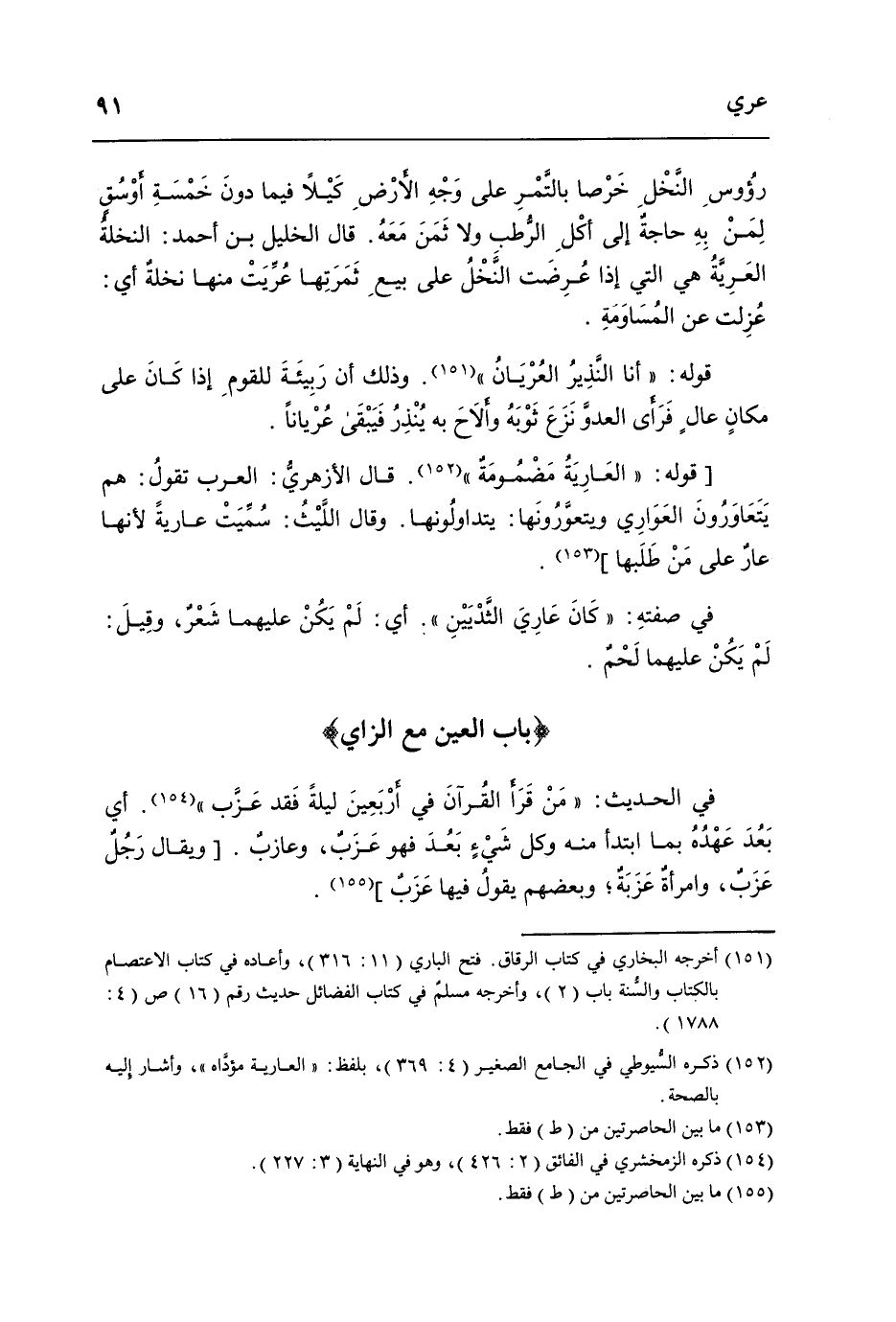 قَوْله أَنا النذير الْعُرْيَان وَذَلِكَ أَن ربيئة للْقَوْم إِذا كَانَ عَلَى مَكَان عَال فَرَأَى الْعَدو نزع ثَوْبه وألاح بِهِ ينذر فَيَبْقَى عُريَانا