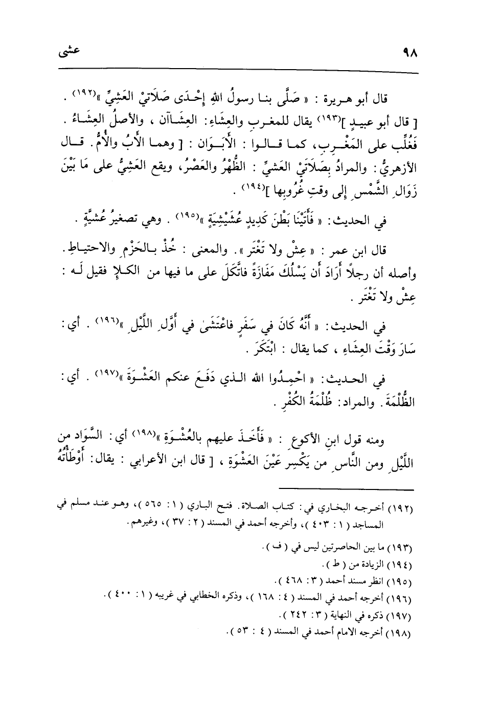 قَالَ أَبُو هُرَيْرَة صَلَّى بِنَا رَسُول الله إِحْدَى صَلَاتي الْعشي قَالَ أَبُو عبيد يُقَال للمغرب وَالْعشَاء العشاءان وَالْأَصْل الْعشَاء فغلب عَلَى الْمغرب كَمَا قَالُوا الأبوان وهما الْأَب وَالأُم قَالَ الْأَزْهَرِي وَالْمرَاد بصلاتي الْعشي الظّهْر وَالْعصر وَيَقَع الْعشي عَلَى مَا بَين زَوَال الشَّمْس إِلَى وَقت غُرُوبهَا