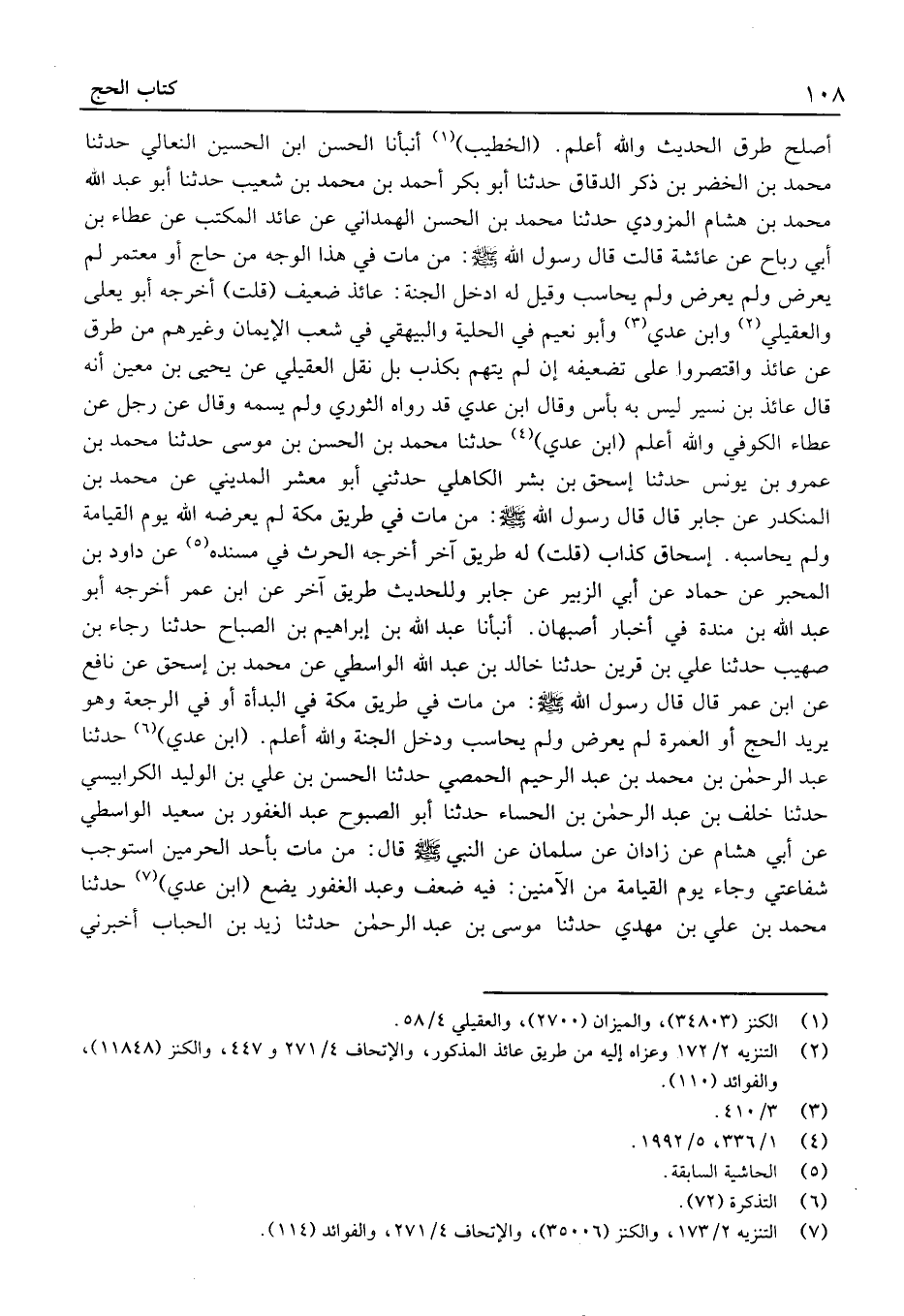 (الْخَطِيب) أَنبأَنَا الْحسن ابْن الْحُسَيْن النعالي حَدَّثَنَا مُحَمَّد بْن الخَضِر بْن ذكر الدّقّاق حَدَّثَنَا أَبُو بَكْر أَحْمَد بْن مُحَمَّد بْن شُعَيْب حَدَّثَنَا أَبُو عَبْد اللَّه مُحَمَّد بْن هِشَام المزودي حَدَّثَنَا مُحَمَّد بْن الْحَسَن الهَمْدانِّي عَنْ عَائِد الْمكتب عَنْ عَطاء بْن أَبِي رَبَاح عَنْ عَائِشَةَ قَالَت قَالَ رَسُول الله: مَنْ مَاتَ فِي هَذَا الْوَجْهِ مِنْ حَاجٍّ أَوْ مُعْتَمِرٍ لَمْ يعرض وَلم يُعْرَضْ وَلَمْ يُحَاسَبْ وَقِيلَ لَهُ ادْخُلِ الْجَنَّةَ: عَائِذ ضَعِيف (قُلْتُ) أَخْرَجَهُ أَبُو يَعْلَى والعُقَيْليّ وَابْن عَدِيّ وَأَبُو نُعَيم فِي الْحِلْية والبَيْهَقيّ فِي شعب الْإِيمَان وَغَيْرُهُمْ منْ طرق عَنْ عَائِذ واقتصروا عَلَى تَضْعِيفه إِن لَمْ يتهم بكذب بل نقل العُقَيْليّ عَنْ يَحْيَى بْن معِين أَنَّهُ قَالَ عَائِذ بْن نسير لَيْسَ بِهِ بَأْس وقَالَ ابْن عَدِيّ قَدْ رَوَاهُ الثَّوْرِيّ وَلم يسمه وقَالَ عَنْ رَجُل عَنْ عَطاء الْكُوفِي وَالله أعلم (ابْن عدي) حَدَّثَنَا مُحَمَّد بْن الْحَسَن بْن مُوسَى حَدَّثَنَا مُحَمَّد بْن عَمْرو بْن يُونُس حَدَّثَنَا إِسْحَاق بْن بشر الْكَاهِلِي حَدَّثَنِي أَبُو مَعْشَر المَدِينيّ عَن مُحَمَّد بْن الْمُنْكَدر عَن جَابِر قَالَ قَالَ رَسُول الله: مَنْ مَاتَ فِي طَرِيقِ مَكَّةَ لَمْ يَعْرِضْهُ اللَّهُ يَوْمَ الْقِيَامَةِ وَلَمْ يُحَاسِبْهُ.