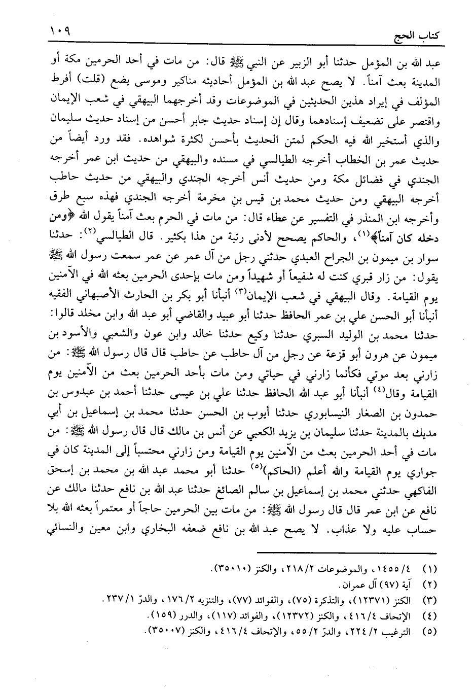 وقَالَ الْبَيْهَقِيّ فِي شعب الْإيِمَان أَنْبَأنَا أَبُو بَكْر بْن الْحَارِث الْأَصْبَهَانِيّ الْفَقِيه أَنْبَأَنَا أَبُو الْحَسَن عَلِيّ بْن عُمَر الْحَافِظ حَدَّثَنَا أَبُو عُبَيْد وَالْقَاضِي أَبُو عَبْد اللَّه وَابْن مَخْلَد قَالُوا: حَدَّثَنَا مُحَمَّد بْن الْوَلِيد السبري حَدَّثَنَا وَكِيع حَدثنَا خَالِد وَابْن عون وَالشعْبِيّ وَالْأسود بن مَيْمُون عَنْ هَارُون أَبُو قزعة عَنْ رَجُل منْ آل حَاطِب عَنْ حَاطِب قَالَ قَالَ رَسُول الله: منْ زارني بعد موتِي فَكَأَنَّمَا زارني فِي حَياتِي وَمن مَاتَ بِأحد الْحَرَمَيْنِ بُعث مِنَ الْآمنينَ يَوْم الْقِيَامَة وقَالَ أَنْبَأَنَا أَبُو عَبْد اللَّه الْحَافِظ حَدَّثَنَا عَلِيّ بْن عِيسَى حَدَّثَنَا أَحْمَد بْن عَبدُوس بْن حمدون بْن الصغار النَّيْسابوريّ حَدَّثَنَا أَيُّوب بْن الْحَسَن حَدَّثَنَا مُحَمَّد بْن إِسْمَاعِيل بْن أَبِي مديك بِالْمَدِينَةِ حَدَّثَنَا سُلَيْمَان بْن يَزِيد الكعبي عَنْ أَنَس بْنِ مَالِكٍ قَالَ قَالَ رَسُولُ الله: مَنْ مَاتَ فِي أَحَدِ الْحَرَمَيْنِ بُعث مِنَ الْآمنينَ يَوْم الْقِيَامَة وَمن زارني محتسبًا إِلَى الْمَدِينَة كَانَ فِي جواري يَوْم الْقِيَامَة واللَّه أَعْلَم (الْحَاكِم) حَدَّثَنَا أَبُو مُحَمَّد عَبْد الله بْن مُحَمَّد بْن إِسْحَاق الفاكهي حَدَّثَنِي مُحَمَّد بْن إِسْمَاعِيل بْن سَالم الصَّائِغ حَدَّثَنَا عَبْد الله بْن نَافِع حَدَّثَنَا مَالك عَنْ نَافِع عَنِ ابْنِ عُمَرَ قَالَ قَالَ رَسُولُ الله: مَنْ مَاتَ بَيْنَ الْحَرَمَيْنِ حَاجًّا أَوْ مُعْتَمِرًا بَعَثَهُ اللَّهُ بِلا حِسَابٍ عَلَيْهِ وَلا عَذَابٍ.