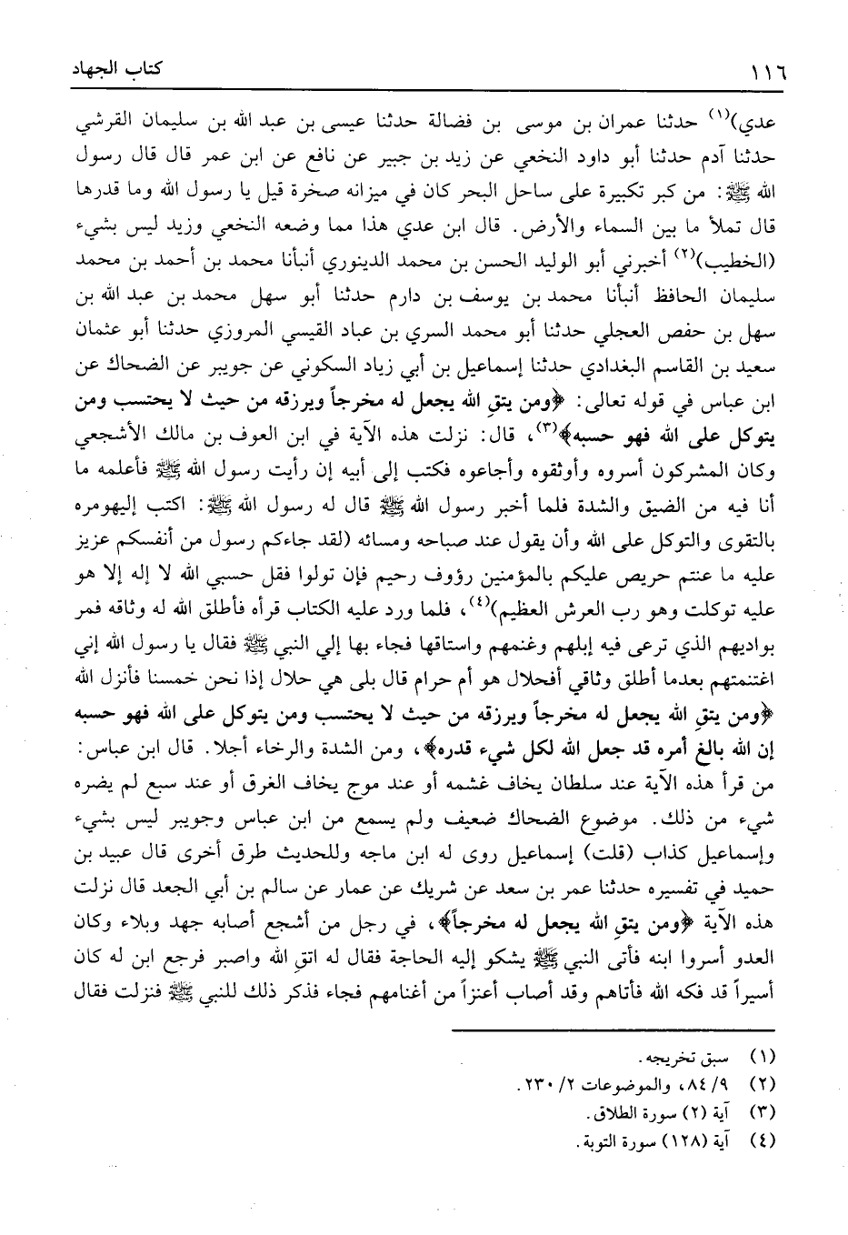 قَالَ ابْن عَدِيّ هَذَا مِمَّا وَضعه النَّخَعي وَزيد لَيْسَ بِشَيْء (الْخَطِيب) أَخْبرنِي أَبُو الْوَلِيد الْحَسَن بْن مُحَمَّد الدِّينَوَرِيّ أَنْبَأنَا مُحَمَّد بْن أَحْمَد بْن مُحَمَّد سُلَيْمَان الْحَافِظ أَنْبَأَنَا مُحَمَّد بْن يُوسُف بْن دارم حَدَّثَنَا أَبُو سهل مُحَمَّد بْن عَبْد اللَّه بْن سهل بْن حَفْص العِجْليّ حَدَّثَنَا أَبُو مُحَمَّد السّري بْن عُبَاد القَيْسيّ المَرْوَزِيّ حَدَّثَنَا أَبُو عُثْمَان سَعِيد بْن الْقَاسِم الْبَغْدَادِيّ حَدَّثَنَا إِسْمَاعِيل بْن أَبِي زِيَاد السَّكُونيّ عَنْ جُوَيْبِر عَنِ الضَّحَّاك عَنِ ابْنِ عَبَّاسٍ فِي قَوْلِهِ تَعَالَى: {وَمَنْ يَتَّقِ اللَّهَ يَجْعَلْ لَهُ مَخْرَجًا وَيَرْزُقْهُ مِنْ حَيْثُ لَا يَحْتَسِبُ وَمَنْ يَتَوَكَّلْ على الله فَهُوَ حَسبه} ، قَالَ: نَزَلَتْ هَذِهِ الآيَةُ فِي ابْنِ الْعَوْفِ بْنِ مَالِكٍ الأَشْجَعِيِّ وَكَانَ الْمُشْرِكُونَ أَسَرُوهُ وَأَوْثَقُوهُ وَأَجَاعُوهُ فَكَتَبَ إِلَى أَبِيهِ إِنْ رَأَيْتَ رَسُول الله فَأَعْلِمْهُ مَا أَنَا فِيهِ مِنَ الضِّيقِ وَالشِّدَّةِ فَلَمَّا أَخْبَرَ رَسُولَ الله قَالَ لَهُ رَسُول الله: اكْتُبْ إِلَيْهِ ومره بِالتَّقْوَى وَالتَّوَكُّلِ عَلَى اللَّهِ وَأَنْ يَقُولَ عِنْدَ صَبَاحِهِ وَمَسَائِهِ {لَقَدْ جَاءَكُمْ رَسُولٌ مِنْ أَنْفُسِكُمْ عَزِيزٌ عَلَيْهِ مَا عَنِتُّمْ حَرِيصٌ عَلَيْكُمْ بِالْمُؤْمِنِينَ رؤوف رَحِيمٌ فَإِنْ تَوَلَّوْا فَقُلْ حَسْبِيَ الله لَا إِلَه إِلَّا هُوَ عَلَيْهِ تَوَكَّلْتُ وَهُوَ رَبُّ الْعَرْشِ الْعَظِيم} ، فَلَمَّا وَرَدَ عَلَيْهِ الْكتاب قَرَأَهُ فَأَطْلَقَ اللَّهُ لَهُ وَثَاقَهُ فَمَرَّ بِوَادِيهِمُ الَّذِي تَرْعَى فِيهِ إِبِلُهُمْ وَغَنَمُهُمْ وَاسْتَاقَهَا فَجَاءَ بِهَا إِلَى النَّبِي فَقَالَ يَا رَسُول الله إِنِّي اغتنمتهم بعد مَا أُطْلِقَ وَثَاقِي أَفَحَلالٌ هُوَ أَمْ حَرَامٌ قَالَ بَلَى هِيَ حَلالٌ إِذَا نَحْنُ خَمَّسْنَا فَأَنْزَلَ اللَّهُ {وَمَنْ يَتَّقِ اللَّهَ يَجْعَلْ لَهُ مَخْرَجًا وَيَرْزُقْهُ مِنْ حَيْثُ لَا يَحْتَسِبُ وَمَنْ يَتَوَكَّلْ عَلَى اللَّهِ فَهُوَ حَسْبُهُ إِنَّ اللَّهَ بَالِغُ أَمْرِهِ قَدْ جَعَلَ اللَّهُ لِكُلِّ شَيْء قدرا} ، وَمِنَ الشِّدَّةِ وَالرَّخَاءِ أَجَلا.
