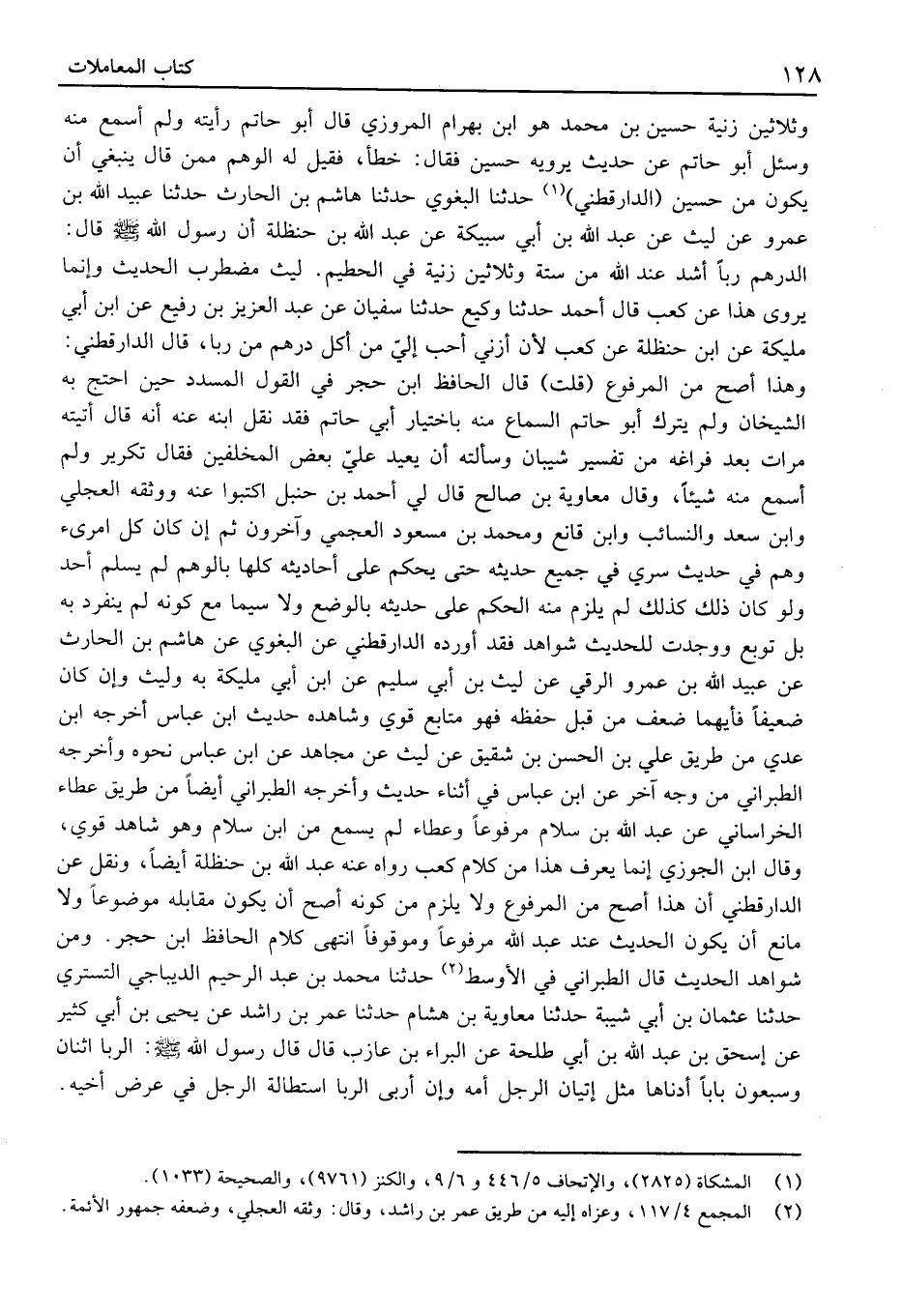 وَثَلاثِينَ زِنْيَةً حُسَيْن بْن مُحَمَّد هُوَ ابْن بهْرَام المَرْوَزِيّ قَالَ أَبُو حَاتِم رَأَيْته وَلَمْ أسمع مِنْهُ وَسُئِلَ أَبُو حَاتِم عَنْ حَدِيث يرويهِ حُسَيْن فَقَالَ: خطأ، فَقِيل لَهُ الْوَهم مِمَّنْ قَالَ يَنْبَغِي أَن يكون منْ حُسَيْن (الدارَقُطْنيّ) حَدَّثَنَا الْبَغَوِيّ حَدَّثَنَا هَاشم بْن الْحَارِث حَدَّثَنَا عُبَيْد اللَّه بْن عَمْرو عَنْ لَيْث عَنْ عبد الله بن أبي سبيكة عَنْ عَبْدِ اللَّهِ بْنِ حَنْظَلَةَ أَن رَسُول الله قَالَ: الدِّرْهَمُ رِبًا أَشَدُّ عِنْدَ اللَّهِ مِنْ سِتَّةٍ وَثَلاثِينَ زِنْيَةً فِي الْحَطِيمِ.