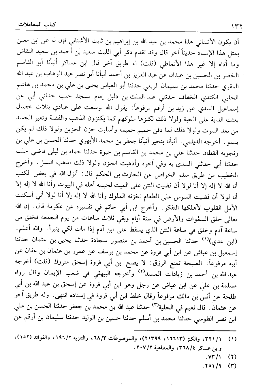 قَالَ نُعَيْم فِي الْحِلْية حَدَّثَنَا عَبْد الله بْن مُحَمَّد بْن جَعْفَر حَدثنَا الْحسن بن عَليّ ابْن نصر الطُّوسيّ حَدَّثَنَا مُحَمَّد بْن أسلم حَدَّثَنَا حُسَيْن بْن الْوَلِيد حَدَّثَنَا سُلَيْمَان بْن أَرقم عَنِ