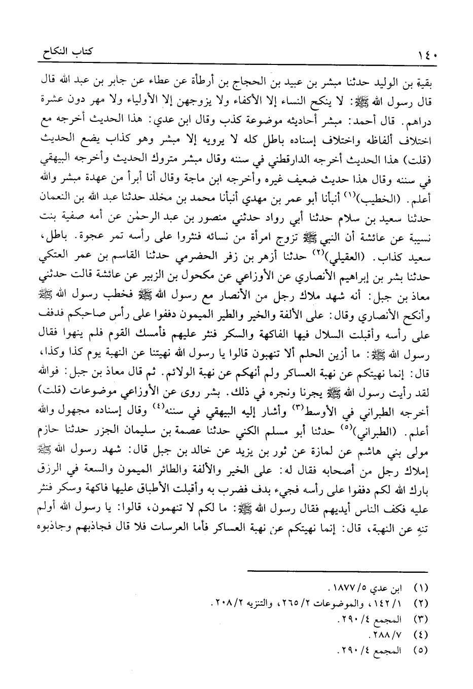 (العُقَيْليّ) حَدَّثَنَا أَزْهَر بْن زفر الْحَضْرَمِيّ حَدَّثَنَا الْقَاسِم بْن عُمَر الْعَتكِي حَدَّثَنَا بشر بْن إِبْرَاهِيم الْأنْصَارِيّ عَن الْأَوْزَاعِيّ عَن مَكْحُول بْن الزُّبَير عَنْ عَائِشَة قَالَتْ حَدَّثَنِي مُعَاذُ بْنُ جَبَلٍ: أَنَّهُ شَهِدَ مِلاكَ رَجُلٍ مِنَ الأَنْصَارِ مَعَ رَسُول الله فَخَطب رَسُول الله وَأَنْكَحَ الأَنْصَارِيَّ وَقَالَ: عَلَى الأُلْفَةِ وَالْخَيْرِ وَالطَّيْرِ الْمَيْمُونِ دَفِّفُوا عَلَى رَأْسِ صَاحِبِكُمْ فَدُفِّفَ عَلَى رَأْسِهِ وَأَقْبَلَتِ السِّلالُ فِيهَا الْفَاكِهَةُ وَالسُّكَّرُ فَنُثِرَ عَلَيْهِمْ فَأَمْسَكَ الْقَوْمُ فَلَمْ ينهوا فَقَالَ رَسُول الله: مَا أَزْيَنَ الْحُلُمَ أَلا تَنْهَبُونَ قَالُوا يَا رَسُولَ اللَّهِ نَهَيْتَنَا عَنِ النُّهْبَةِ يَوْمَ كَذَا وَكَذَا، قَالَ: إِنَّمَا نَهَيْتُكُمْ عَنْ نُهْبَةِ الْعَسَاكِرِ وَلَمْ أَنْهَكُمْ عَنْ نُهْبَةِ الْوَلائِمِ.