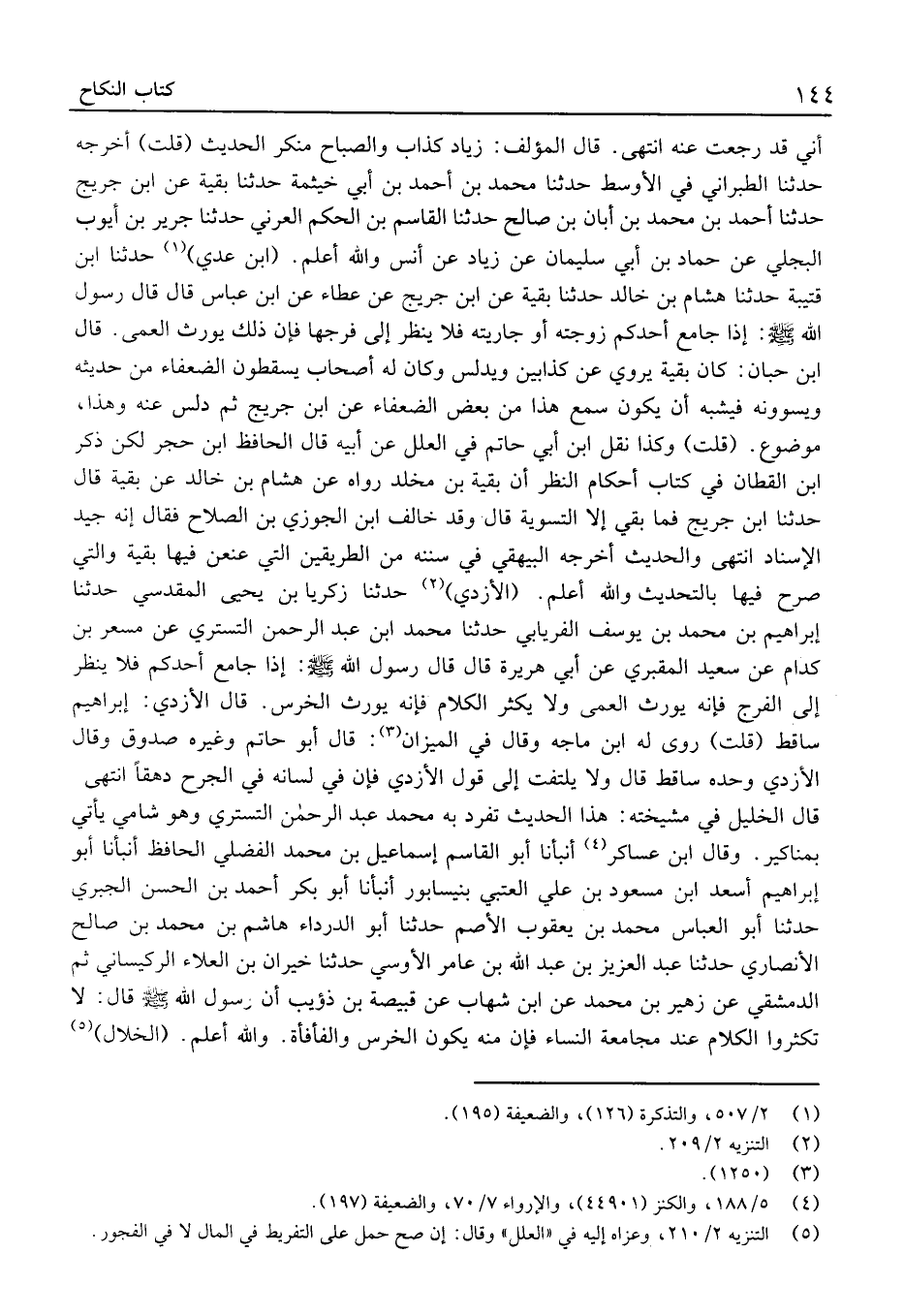 (قُلْتُ) وَكَذَا نقل ابْن أَبِي حاتِم فِي الْعِلَل عَن أَبِيه قَالَ الْحَافِظ ابْن حجر لَكِن ذكر ابْن الْقطَّان فِي كتاب أَحْكَام النّظر أَن بَقِيَّة بْن مَخْلَد رَوَاهُ عَنْ هِشَام بْن خَالِد عَنْ بَقِيَّة قَالَ حَدَّثَنَا ابْن جريج فَمَا بَقِي إِلَّا التَّسْوِيَة قَالَ وَقَدْ خَالف ابْن الْجَوْزِيّ بن الصّلاح فَقَالَ إنَّه جيد الْإِسْنَاد انْتهى والْحَدِيث أَخْرَجَهُ البَيْهَقيّ فِي سنَنه مِنَ الطَّرِيقَيْنِ الَّتِي عنعن فِيهَا بَقِيَّة وَالَّتِي صرح فِيهَا بِالتَّحْدِيثِ واللَّه أَعْلَم.
