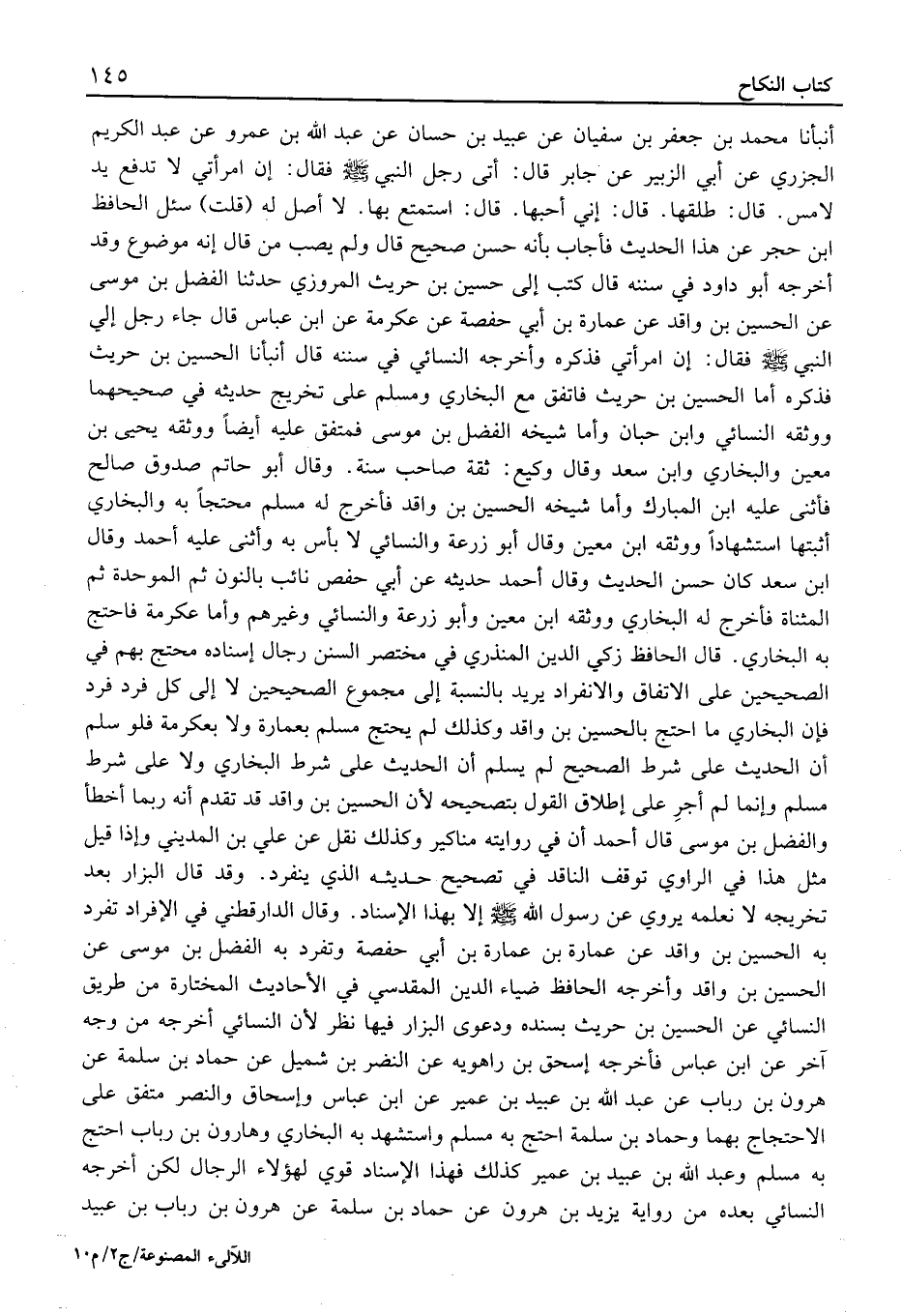 قَالَ الْحَافِظ زكي الدّين المُنْذريّ فِي مُخْتَصر السّنَن رجال إِسْنَاده مُحْتَج بهم فِي الصَّحِيحَيْنِ عَلَى الِاتِّفَاق والانفراد يُرِيد بِالنِّسْبَةِ إِلَى مَجْمُوع الصَّحِيحَيْنِ لَا إِلَى كُلّ فَرد فَرد فَإِن الْبُخَارِيّ مَا احْتج بالحسين بْن وَاقد وَكَذَلِكَ لَمْ يحْتَج مُسْلِم بعمارة وَلَا بِعِكْرِمَةَ فَلَو سلم أَن الْحَدِيث عَلَى شَرط الصَّحِيح لم يسلم بِأَن الْحَدِيث عَلَى شَرط الْبُخَارِيّ وَلَا عَلَى شَرط مُسْلِم وَإِنَّمَا لَمْ أجر عَلَى إِطْلَاق القَوْل بِتَصْحِيحِهِ لِأَن الْحُسَيْن بْن وَاقد قَدْ تقدم أَنَّهُ رُبمَا أَخطَأ وَالْفضل بْن مُوسَى قَالَ أَحْمَد أَن فِي رِوَايَته مَنَاكِير وَكَذَلِكَ نقل عَنْ عَلِيّ بْن المَدِينيّ وَإِذَا قِيلَ مثل هَذَا فِي الرَّاوِي توقف النَّاقِد فِي تَصْحِيح حَدِيثه الَّذِي ينْفَرد.