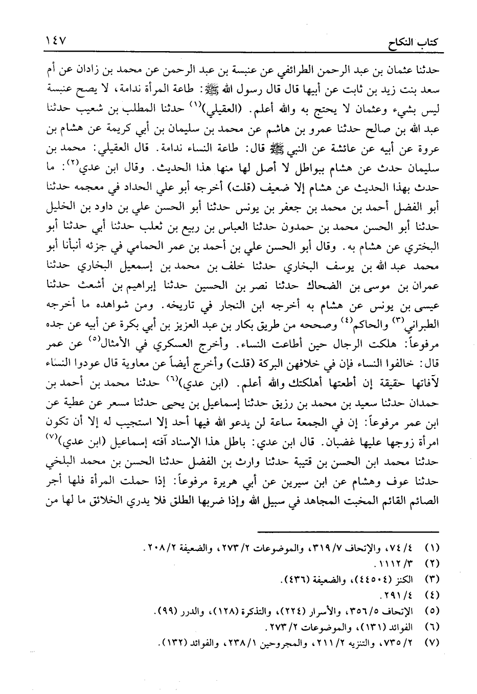 (العُقَيْليّ) حَدَّثَنَا المطَّلِب بْن شُعَيْب حَدَّثَنَا عَبْد الله بْن صالِح حَدَّثَنَا عَمْرو بْن هَاشم عَنْ مُحَمَّد بْن سُلَيْمَان بْن أَبِي كَرِيمَة عَن هِشَام بْن عُرْوَة عَن أَبِيهِ عَن عَائِشَةَ عَنِ النَّبِيِّ قَالَ: طَاعَةُ النِّسَاءِ نَدَامَةٌ.