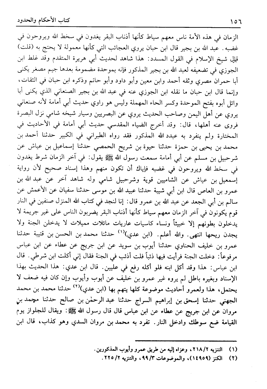عَبْد اللَّه بْن بجير قَالَ ابْن حَبَّان يرْوى الْعَجَائِب الَّتِي كأَنَّها معمولة لَا يحْتَج بِهِ (قُلْتُ) قَالَ شيخ الْإِسْلَام فِي القَوْل المسدد: هَذَا شَاهد لحَدِيث أَبِي هُرَيْرَةَ الْمُتَقَدّم وَقَدْ غلط ابْن الْجَوْزِيّ فِي تَضْعِيفه لعبد اللَّه بْن بجير الْمَذْكُور فَإنَّهُ بموحدة مَضْمُومَة بعْدهَا جِيم مصغر يكنى أَبَا حمْرَان مصري وثّقه أَحْمَد وابْن معِين وأَبُو دَاوُد وأَبُو حَاتِم وَذكره ابْن حَبَّان فِي الثِّقَات، وَإِنَّمَا قَالَ ابْن حَبَّان مَا نَقله ابْن الْجَوْزِيّ عَنْهُ فِي عَبْد اللَّه بْن بجير الصَّنعْاني الَّذِي يكنى أَبَا وَائِل أَبوهُ بِفَتْح الْمُوَحدَة وَكسر الْحَاء الْمُهْملَة وَلَيْسَ هُوَ رَاوِي حَدِيث أَبِي أُمَامَة لِأَنَّهُ صنعاني يروي عَنْ أَهْل الْيمن وَصَاحب الْحَدِيث يروي عَنِ الْبَصرِيين وسيار شَيْخه شَامي نزل الْبَصْرَة فروى عَنْهُ أَهلهَا، قَالَ: وَقَدْ أخرج الضياء المقدسيّ حَدِيث أبي أُمَامَة فِي الْأَحَادِيث فِي المختارة ولَمْ ينْفَرد بِهِ عَبْد اللَّه الْمَذْكُور فقد رَوَاهُ الطَّبَرَانِيّ فِي الْكَبِير حَدَّثَنَا أَحْمَد بْن مُحَمَّد بْن يَحْيَى بْن حَمْزَة حَدَّثَنَا حَيْوَة بْن شُرَيْح الْحِمصِي حَدَّثَنَا إِسْمَاعِيل بْن عَيَّاش عَن شُرَحْبيل بْن مُسْلِم عَنْ أَبِي أُمَامَة سَمِعت رَسُول الله يَقُولُ: فِي آخر الزَّمَان شَرط يَغْدُونَ فِي سَخَطِ اللَّهِ وَيَرُوحُونَ فِي غَضَبه فإياك أَن تكون مِنْهُم وَهَذَا إِسْنَاد صَحِيح لِأَن رِوَايَة إِسْمَاعِيل بْن عَيَّاش عَنِ الشاميين قَوِيَّة وشُرَحْبيل شَامي وَلَهُ شَاهد آخر عَنْ عَبْد اللَّه بْنِ عَمْرِو بْنِ الْعَاصِ قَالَ ابْن أَبِي شَيْبَة حَدَّثَنَا عُبَيْد الله بْن مُوسَى حَدَّثَنَا سُفْيَان عَنِ الْأَعْمَشُ عَنْ سَالم بْن أَبِي الْجَعْد عَنْ عَبْد اللَّه بْن عَمْرو قَالَ: إِنَّا لنجد فِي كتاب اللَّه الْمنزل صنفين فِي النَّار قوم يكونُونَ فِي آخر الزَّمَان مَعَهم سياط كأَنَّها أَذْنَاب الْبَقر يضْربُونَ النّاس عَلَى غير جريمة لَا يدْخلُونَ بطونهم إِلَّا خبيثة وَنسَاء كاسيات عاريات مائلات مميلات لَا يدخلن الجَنَّة وَلَا يجدن رِيحهَا انْتهى.