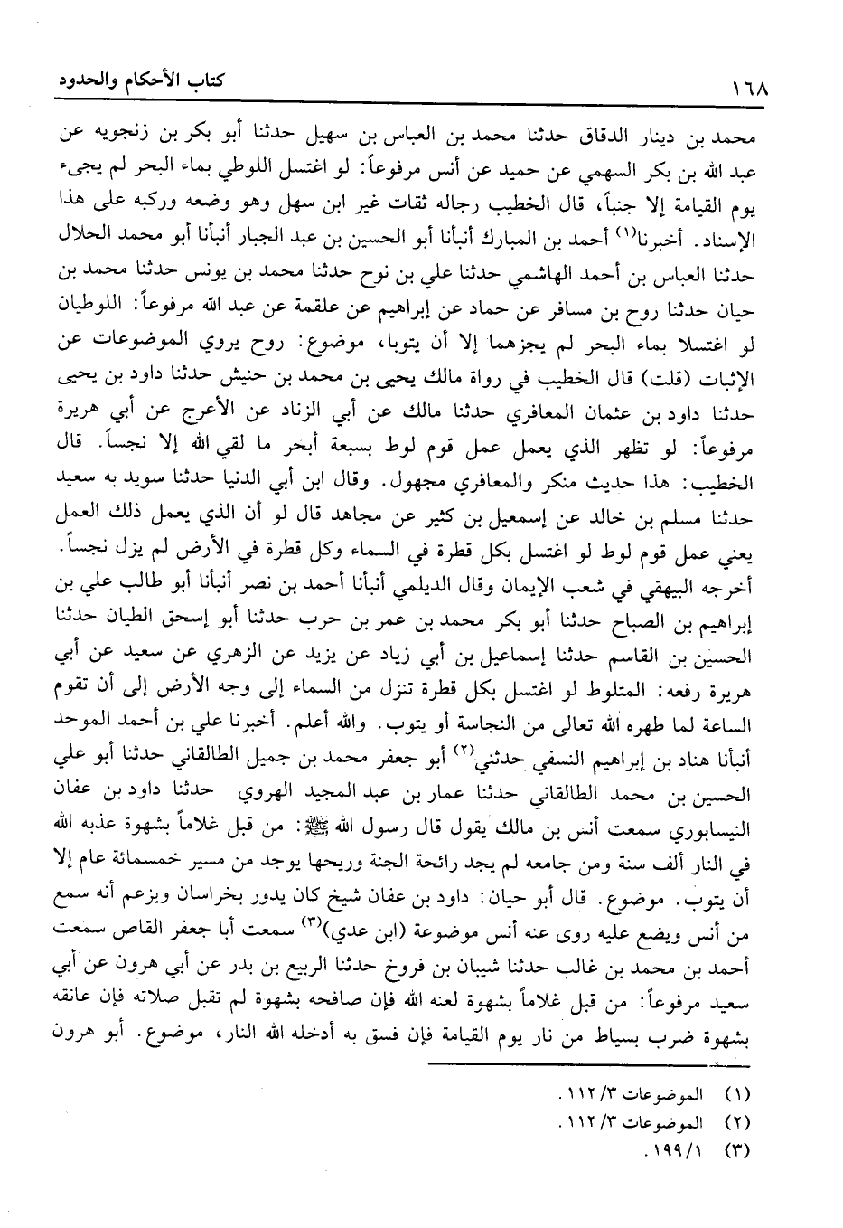 أخبرنَا أَحْمد بن الْمُبَارك أَنْبَأَنَا أَبُو الْحُسَيْن بْن عَبْد الْجَبَّار أَنْبَأَنَا أَبُو مُحَمَّد الْحَلَال حَدَّثَنَا الْعَبَّاس بْن أَحْمَد الْهَاشِمِي حَدَّثَنَا عَلِيّ بْن نوح حَدَّثَنَا مُحَمَّد بْن يُونُس حَدَّثَنَا مُحَمَّد بْن حَيَّان حَدَّثَنَا روح بْن مُسَافر عَنْ حَمَّاد عَنْ إِبْرَاهِيم عَن عَلْقَمَة عَن عَبْدِ اللَّهِ مَرْفُوعًا: اللُّوطِيَّانِ لَوِ اغْتَسَلا بِمَاءِ الْبَحْرِ لَمْ يُجِزْهُمَا إِلا أَنْ يَتُوبَا، مَوْضُوع: روح يرْوى الموضوعات عَنِ الْإِثْبَات (قُلْتُ) قَالَ الْخَطِيب فِي رُوَاة مَالك بْن يَحْيَى بْن مُحَمَّد بْن حنيش حَدَّثَنَا دَاوُد بْن يَحْيَى حَدَّثَنَا دَاوُد بْن عُثْمَان المَعَافِرِي حَدَّثَنَا مَالك عَنْ أَبِي الزِّنَاد عَن الْأَعْرَج عَن أَبِي هُرَيْرَةَ مَرْفُوعا: لَو تظهر الَّذِي يَعْمَلُ عَمَلَ قَوْمِ لُوطٍ بِسَبْعَةِ أَبْحُرٍ مَا لَقِيَ اللَّهَ إِلا نَجِسًا.