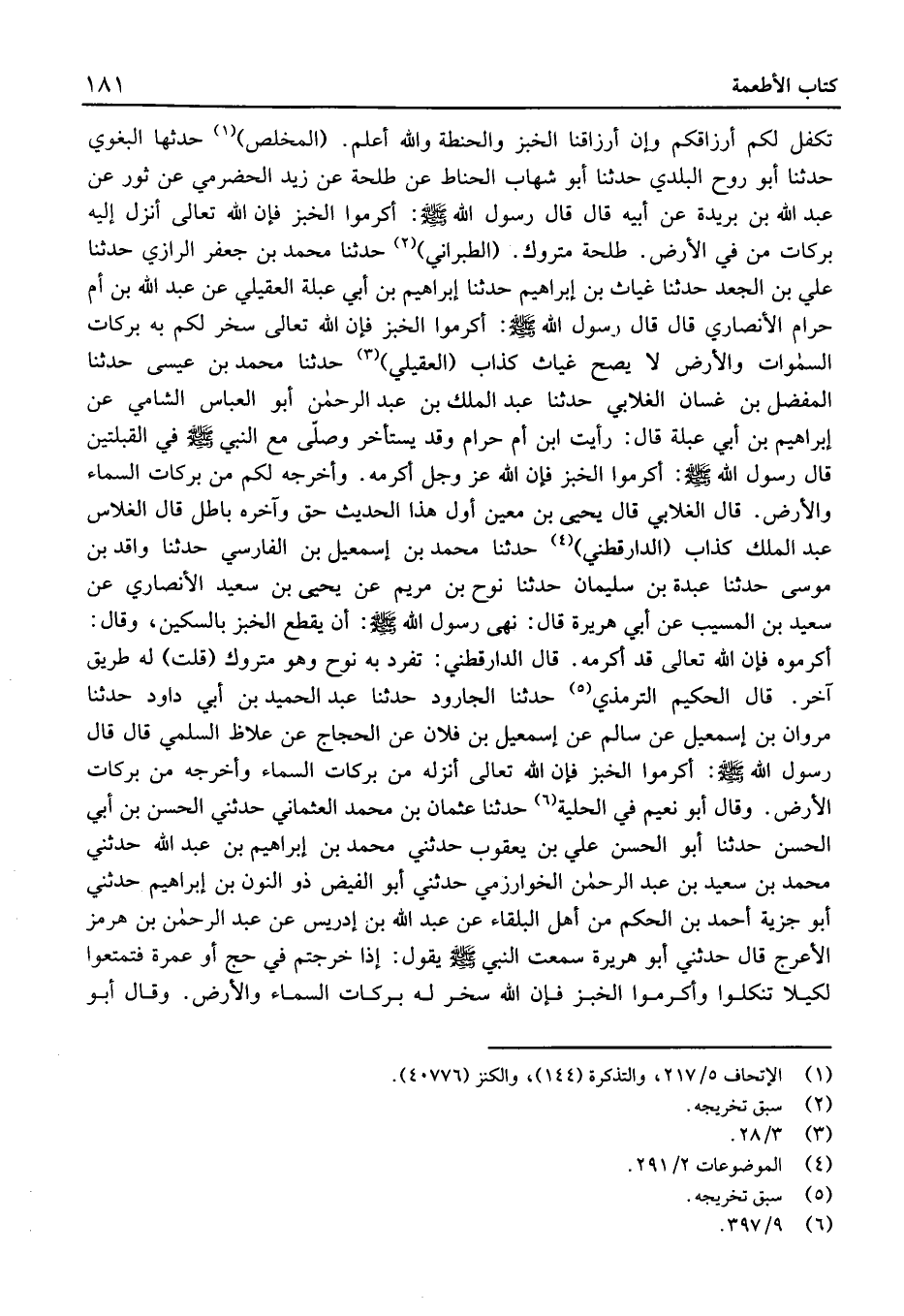 (الطَّبَرَانِيّ) حَدَّثَنَا مُحَمَّد بْن جَعْفَر الرَّازيّ حَدَّثَنَا عَلِيّ بْن الْجَعْد حَدَّثَنَا غياث بْن إِبْرَاهِيم حَدَّثَنَا إِبْرَاهِيم بْن أَبِي عبلة العُقَيْليّ عَنْ عَبْدِ الله بن أُمِّ حَرَامٍ الأَنْصَارِيِّ قَالَ قَالَ رَسُول الله: أَكْرِمُوا الْخُبْزَ فَإِنَّ اللَّهَ تَعَالَى سخر لكم بِهِ بَرَكَات السَّمَوَات وَالأَرْضِ لَا يَصِّحُ غياث كَذَّاب (العُقَيْليّ) حَدَّثَنَا مُحَمَّد بْن عِيسَى حَدَّثَنَا الْمُفَضَّل بْن غَسَّان الْغلابِي حَدَّثَنَا عَبْد الْملك بْن عَبْد الرَّحْمَن أَبُو الْعَبَّاس الشَّامي عَنْ إِبْرَاهِيمَ بْنِ أَبِي عَبْلَةَ قَالَ رَأَيْتُ ابْنَ أُمِّ حَرَامٍ وَقَدْ يسْتَأْخر وَصلى مَعَ النَّبِي فِي الْقِبْلَتَيْنِ قَالَ رَسُولُ اللَّهِ: أَكْرِمُوا الْخُبْزَ فَإِنَّ اللَّهَ عَزَّ وَجَلَّ أَكْرَمَهُ.