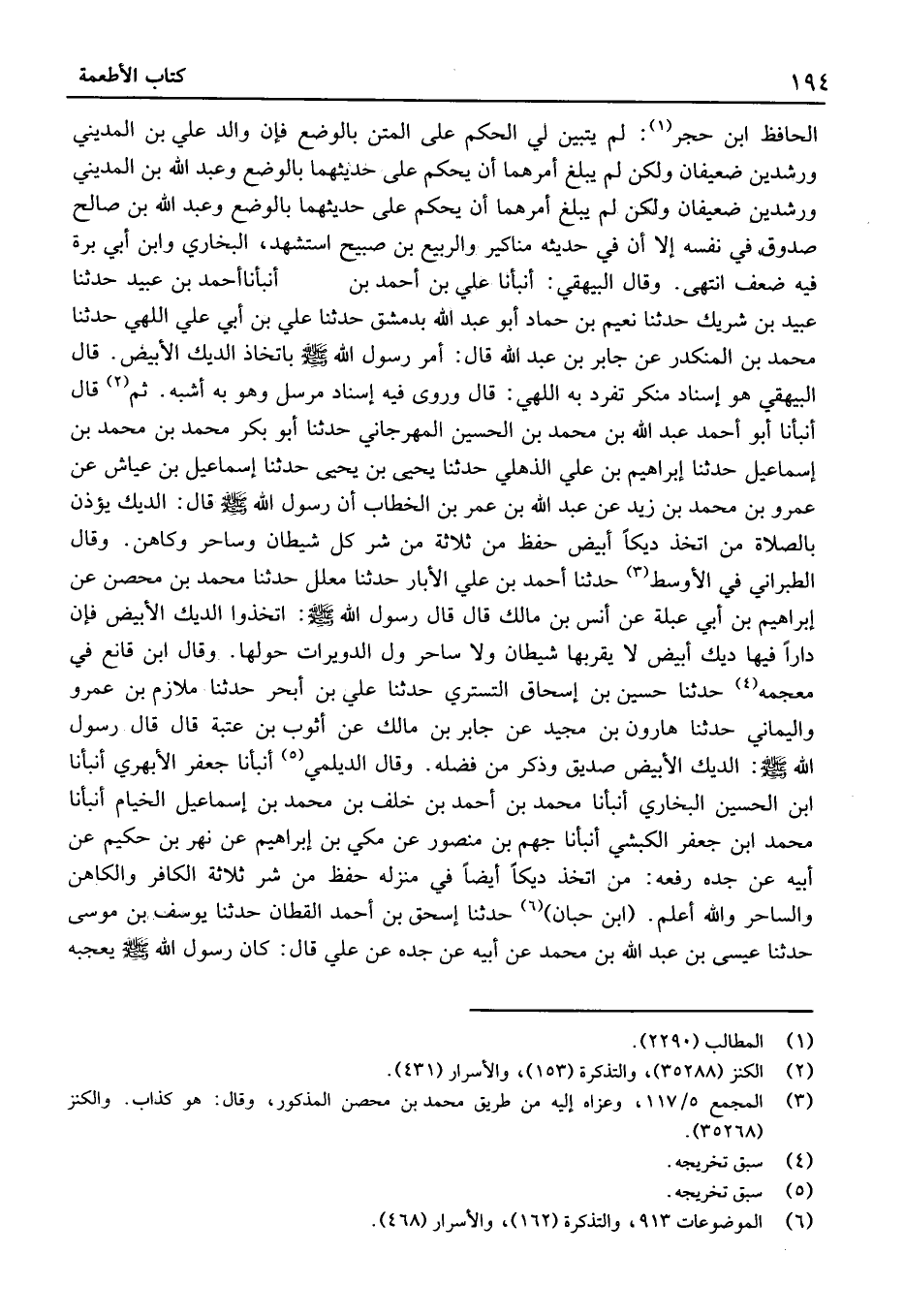 وقَالَ البَيْهَقيّ: أَنبأَنَا عَلِيّ بْن أَحْمَد بْن أَنْبَأنَا أَحْمَد بْن عُبَيْد حَدَّثَنَا عُبَيْد بْن شريك حَدَّثَنَا نُعَيم بْن حَمَّاد أَبُو عَبْد اللَّه بِدِمَشْق حَدَّثَنَا عَلِيّ بْن أَبِي عَليّ اللهي حَدَّثَنَا مُحَمَّد بْن المُنْكَدِر عَنْ جَابِر بْن عَبْد الله قَالَ: أَمر رَسُول الله بِاتِّخَاذِ الدِّيكِ الأَبْيَضِ.