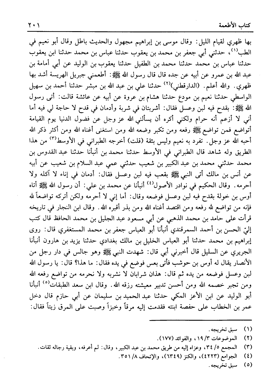(الدارَقُطْنيّ) حَدَّثَنَا عَلِيّ بْن عَبْد الله بْن مُبشر حَدَّثَنَا أَحْمَد بْن سُهَيْل الواسطيّ حَدَّثَنَا نُعَيم بْن مُودع حَدَّثَنَا هِشَام بْن عُرْوَة عَن أَبِيهِ عَنْ عَائِشَةَ قَالَتْ: أُتِيَ رَسُول الله: بِقَدَحٍ فِيهِ لَبَنٌ وَعَسَلٌ فَقَالَ: أَشَرْبَتَانِ فِي شَرْبَةٍ وَأُدْمَانِ فِي قَدَحٍ لَا حَاجَةَ لِي فِيهِ أَمَا إِنِّي لَا أَزْعُمُ أَنَّهُ حَرَامٌ وَلَكِنِّي أَكْرَهُ أَنْ يَسْأَلَنِي اللَّهُ عَزَّ وَجَلَّ عَنْ فُضُولِ الدُّنْيَا يَوْمَ الْقِيَامَةِ أَتَوَاضَعُ فَمَنْ تواضع رَفَعَهُ وَمَنْ تَكَبَّرَ وَضَعَهُ اللَّهُ وَمَنِ اسْتَغْنَى أَغْنَاهُ اللَّهُ وَمَنْ أَكْثَرَ ذِكْرَ اللَّهِ أَحَبَّهُ اللَّهُ عَزَّ وَجَلَّ.