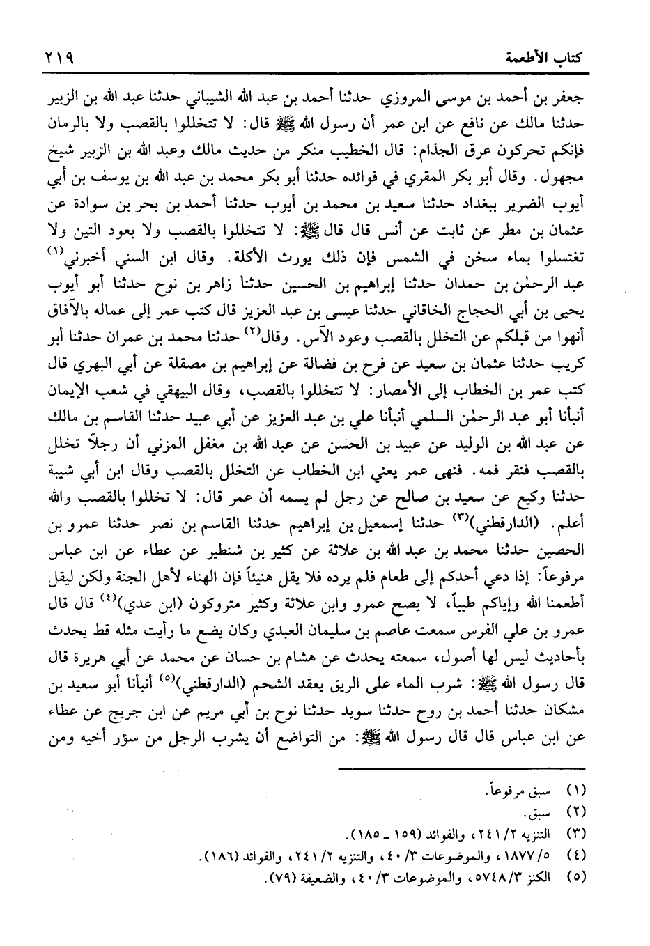 (الدارَقُطْنيّ) حَدَّثَنَا إِسْمَاعِيل بْن إِبْرَاهِيم حَدَّثَنَا الْقَاسِم بْن نصر حَدَّثَنَا عَمْرو بْن الْحصين حَدَّثَنَا مُحَمَّد بْن عَبْد الله بْن علاثة عَنْ كثير بْن شنطير عَن عَطاء عَنِ ابْنِ عَبَّاسٍ مَرْفُوعًا: إِذَا دُعِيَ أَحَدُكُمْ إِلَى طَعَامٍ فَلَمْ يَرُدَّهُ فَلا يَقُلْ هَنِيئًا فَإِنَّ الْهَنَاءَ لأَهْلِ الْجَنَّةِ وَلَكِنْ لِيَقُلْ أَطْعَمَنَا اللَّهُ وَإِيَّاكُمْ طَيِّبًا، لَا يَصِّحُ عَمْرو وَابْن علاثة وَكثير متروكون (ابْن عَدِيّ) قَالَ قَالَ عَمْرو بْن عَلَى الْفرس سَمِعت عَاصِم بن سُلَيْمَان الْعَبْدِيّ وَكَانَ يضع مَا رَأَيْت مثله قطّ يحدث بِأَحَادِيث لَيْسَ لَهَا أصُول، سَمِعْتُهُ يحدث عَن هِشَام بْن حسان عَن مُحَمَّد عَنْ أَبِي هُرَيْرَةَ قَالَ قَالَ رَسُول الله: شُرْبُ الْمَاءِ عَلَى الرِّيقِ يَعْقِدُ الشَّحْمَ (الدارَقُطْنيّ) أَنْبَأَنَا أَبُو سَعِيد بْن مشكان حَدَّثَنَا أَحْمَد بْن روح حَدَّثَنَا سُوَيْد حَدَّثَنَا نوح بْن أَبِي مَرْيَم عَنِ ابْن جريج عَن عَطاء عَن ابْن عَبَّاس قَالَ قَالَ رَسُول الله: مِنَ التَّوَاضُعِ أَنْ يَشْرَبَ الرَّجُلُ من سُؤْر أَخِيه وَمن