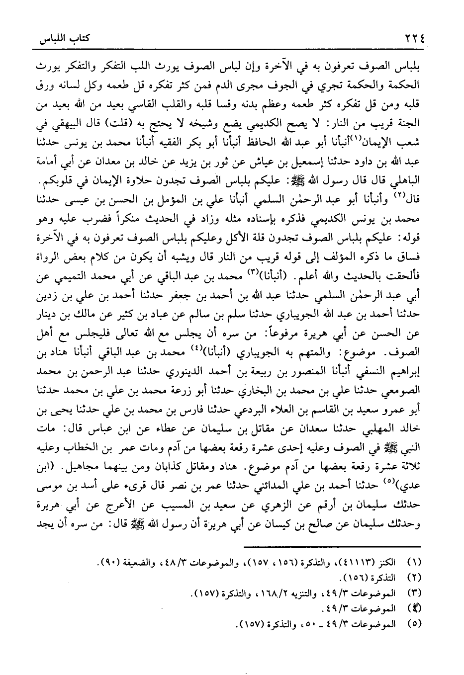 قَالَ وأَنْبَأَنَا أَبُو عَبْد الرَّحْمَن السّلمِيّ أَنْبَأنَا عَلِيّ بْن المؤمل بْن الْحَسَن بْن عِيسَى حَدَّثَنَا مُحَمَّد بْن يُونُس الْكُدَيْمِي فَذَكَرَه بِإِسْنَادِهِ مثله وَزَاد فِي الْحَدِيث مُنْكرا فَضرب عَلَيْه وَهُوَ قَوْله: عَلَيْكُم بلباس الصُّوف تَجِدُونَ قلَّة الْأكل وعلكيم بِلِبَاسِ الصُّوفِ تُعْرَفُونَ بِهِ فِي الْآخِرَة فساق مَا ذكره الْمُؤلف إِلَى قَوْله قريب مِنَ النَّار قَالَ وَيُشبه أَن يكون منْ كَلَام بعض الروَاة فألحقت بِالْحَدِيثِ وَالله أعلم.