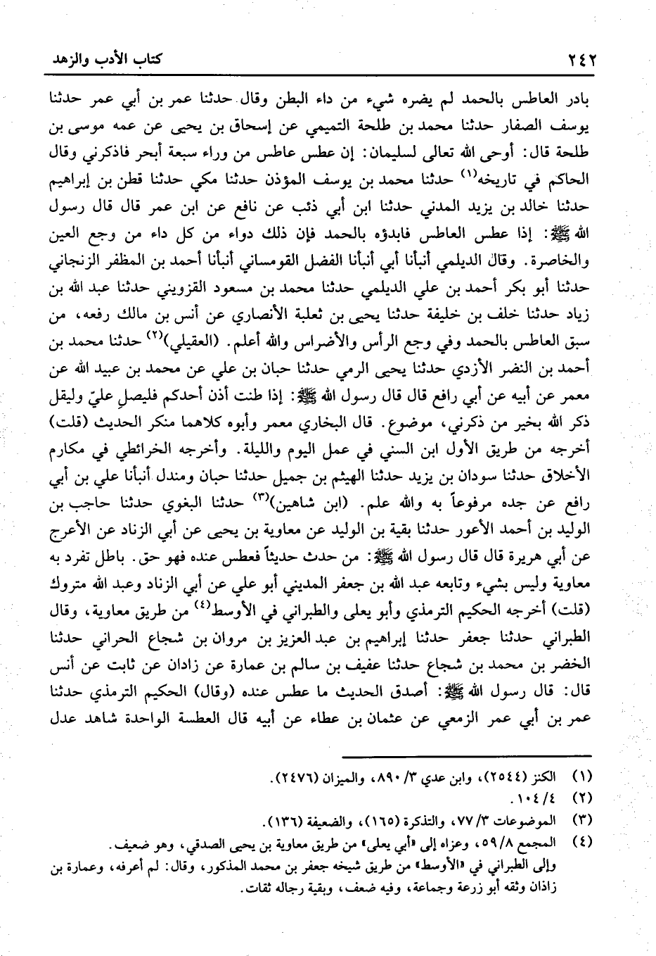 بَادَرَ الْعَاطِسَ بِالْحَمْدِ لَمْ يَضُرَّهُ شَيْءٌ مِنْ دَاءِ الْبَطْنِ وقَالَ حَدَّثَنَا عُمَرَ بْن أَبِي عُمَرَ حَدَّثَنَا يُوسُف الصفار حَدَّثَنَا مُحَمَّد بْن طَلْحَة التَّمِيمِيّ عَنْ إِسْحَاق بْن يَحْيَى عَن عَمه مُوسَى بْنِ طَلْحَةَ قَالَ: أَوْحَى اللَّهُ تَعَالَى لِسُلَيْمَانَ: إِنْ عَطَسَ عَاطِسٌ مِنْ وَرَاءِ سَبْعَةِ أَبْحُرٍ فَاذْكُرْنِي وَقَالَ الْحَاكِم فِي تَارِيخه حَدَّثَنَا مُحَمَّد بْن يُوسُف الْمُؤَذّن حَدَّثَنَا مكّيّ حَدَّثَنَا قطن بْن إِبْرَاهِيم حَدَّثَنَا خَالِد بْن يَزِيد الْمَدَنِيّ حَدَّثَنَا ابْن أَبِي ذِئْب عَن نَافِع عَنِ ابْنِ عُمَرَ قَالَ قَالَ رَسُول الله: إِذَا عَطَسَ الْعَاطِسُ فَابْدَؤُهُ بِالْحَمْدِ فَإِنَّ ذَلِكَ دَوَاءٌ مِنْ كُلِّ دَاءٍ مِنْ وَجَعِ الْعَيْنِ وَالْخَاصِرَةِ.