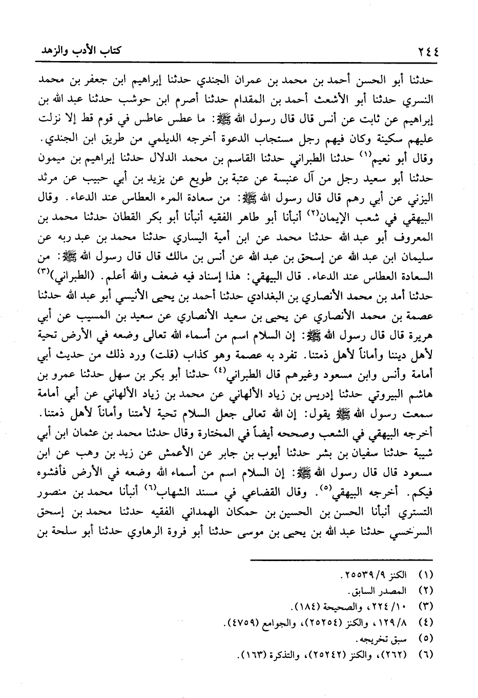 (الطَّبَرَانِيّ) حَدثنَا أمد بْن مُحَمَّد الْأَنْصَارِيّ بْن الْبَغْدَادِيّ حَدَّثَنَا أَحْمَد بْن يَحْيَى الأنيسي أَبُو عَبْد اللَّه حَدَّثَنَا عصمَة بْن مُحَمَّد الْأَنْصَارِيّ عَنْ يَحْيَى بْن سَعِيد الْأنْصَارِيّ عَن سَعِيد بْن الْمسيب عَن أَبِي هُرَيْرَةَ قَالَ قَالَ رَسُول الله: إِنَّ السَّلامَ اسْمٌ مِنْ أَسْمَاءِ اللَّهِ تَعَالَى وَضَعَهُ فِي الأَرْضِ تَحِيَّةً لأَهْلِ دِينِنَا وَأَمَانًا لأَهْلِ ذِمَّتِنَا.