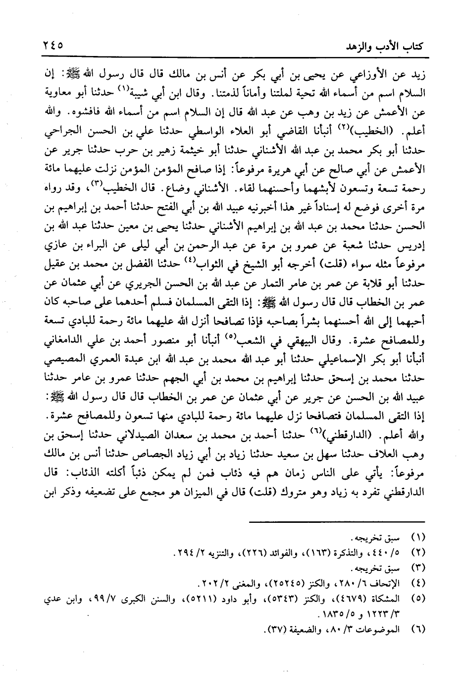 (الْخَطِيب) أَنْبَأنَا القَاضِي أَبُو الْعَلاء الواسطيّ حَدَّثَنَا عَلِيّ بْن الْحَسَن الجراحي حَدَّثَنَا أَبُو بَكْر مُحَمَّد بْن عَبْد الله الْأُشْنَانِي حَدَّثَنَا أَبُو خَيْثَمَة زُهَيْر بْن حَرْب حَدَّثَنَا جرير عَنِ الْأَعْمَشُ عَن أَبِي صالِح عَن أَبِي هُرَيْرَةَ مَرْفُوعًا: إِذَا صَافَحَ الْمُؤْمِنُ الْمُؤْمِنَ نَزَلَتْ عَلَيْهِمَا مِائَةُ رَحْمَةٍ تِسْعَةٌ وَتِسْعُونَ لأَبَشِّهِمَا وَأَحْسَنِهِمَا لِقَاءً.