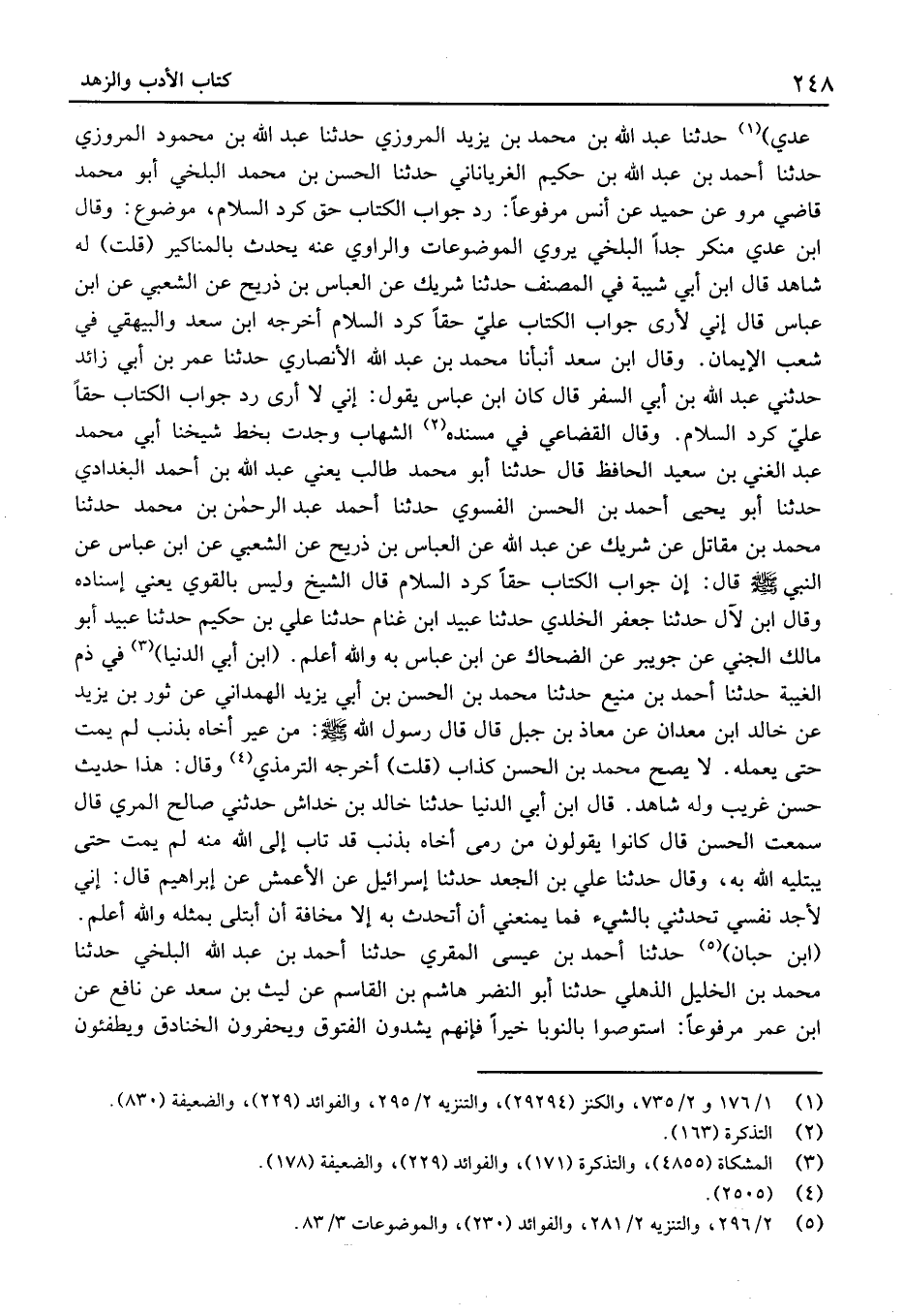 عدي) حَدَّثَنَا عَبْد الله بْن مُحَمَّد بْن يَزِيد المَرْوَزِيّ حَدَّثَنَا عَبْد اللَّه بْن مَحْمُود المَرْوَزِيّ حَدَّثَنَا أَحْمَد بْن عَبْد الله بْن حَكِيم الغرياناني حَدَّثَنَا الْحَسَن بْن مُحَمَّد الْبَلْخِيّ أَبُو مُحَمَّد قَاض مَرْو عَنْ حُمَيد عَنْ أَنَسٍ مَرْفُوعًا: رَدُّ جَوَابِ الْكتاب حَقٌّ كَرَدِّ السَّلامِ، مَوْضُوع: وقَالَ ابْن عَدِيّ مُنْكَر جدا الْبَلْخِيّ يرْوى الموضوعات والراوي عَنْهُ يحدث بِالْمَنَاكِيرِ (قُلْتُ) لَهُ شَاهد قَالَ ابْن أبي شيبَة فِي المُصَنّف حَدَّثَنَا شريك عَنِ الْعَبَّاس بْن ذريح عَن الشِّعْبِيّ عَنِ ابْنِ عَبَّاسٍ قَالَ إِنِّي لأرى جَوَاب الْكتاب عَلَى حَقًا كرد السَّلَام أَخْرَجَهُ ابْن سَعْد والبَيْهَقيّ فِي شعب الْإِيمَان.