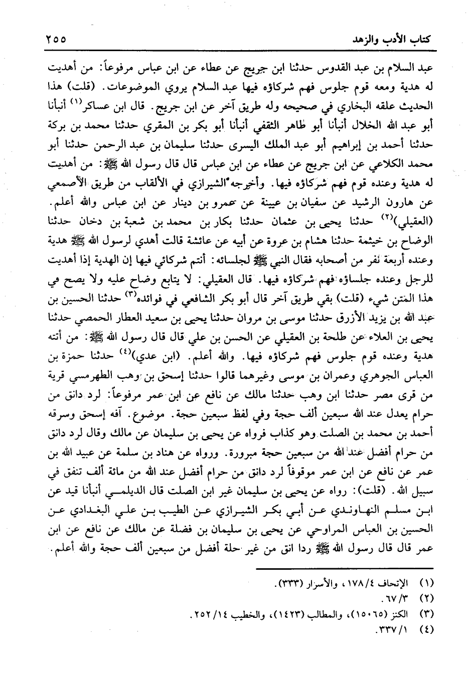 عَبْد السَّلَام بْن عَبْد القدوس حَدَّثَنَا ابْن جريج عَن عَطاء عَنِ ابْنِ عَبَّاسٍ مَرْفُوعًا: مِنْ أهديت لَهُ هَدِيَّة وَمَعَهُ قوم جُلُوس فهم شركاؤه فِيهَا عَبْد السَّلَام يرْوى الموضوعات.