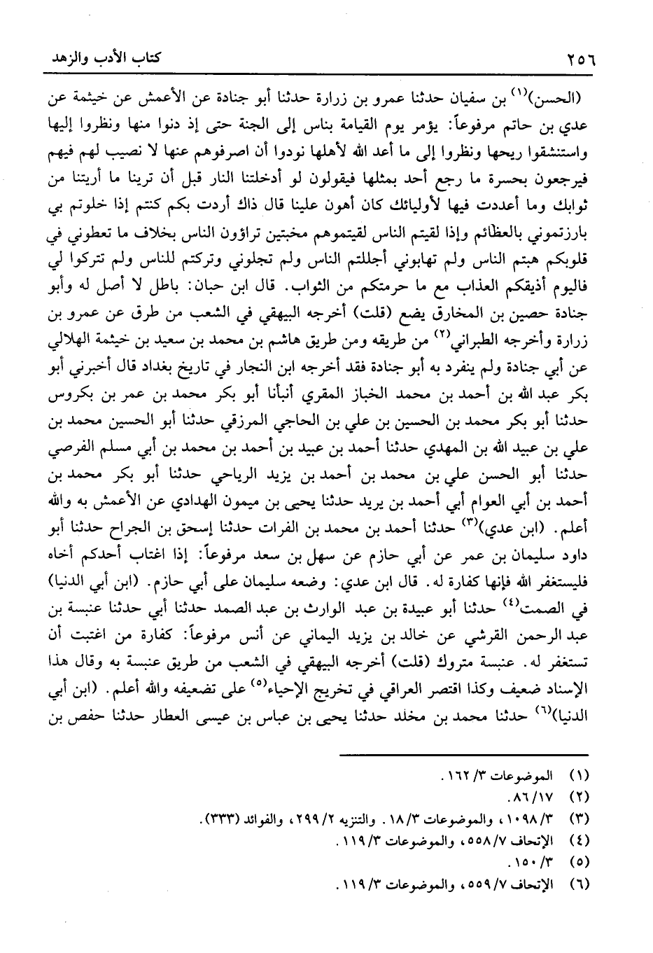 (الْحَسَن) بْن سُفْيَان حَدَّثَنَا عَمْرو بْن زُرَارَة حَدَّثَنَا أَبُو جُنَادَة عَنِ الْأَعْمَشُ عَنْ خَيْثَمَة عَنْ عَدِيّ بْن حَاتِم مَرْفُوعًا: يُؤمر يَوْم الْقِيَامَة بناس إِلَى الجَنَّة حَتَّى إِذْ دنوا مِنْهَا ونظروا إِلَيْهَا واستنشقوا رِيحهَا ونظروا إِلَى مَا أعد اللَّه لأَهْلهَا نُودُوا أَن أصرفوهم عَنْهَا لَا نصيب لَهُم فيهم فيرجعون بحسرة مَا رَجَعَ أحد بِمِثْلِهَا فَيَقُولُونَ لَو أدخلتنا النَّار قبل أَن ترينا مَا أريتنا منْ ثوابك وَمَا أَعدَدْت فِيهَا لأوليائك كَانَ أَهْون علينا قَالَ ذَاك أردْت بكم كُنْتم إِذا خلوتم بِي بارزتموني بالعظائم وَإِذَا لَقِيتُم النَّاس لقيتموهم مخبتين تراؤون النّاس بِخِلَاف مَا تعطوني فِي قُلُوبكُمْ هبتم النّاس وَلم تهابوني أجللتم النّاس وَلم تجلوني وتركتم للنَّاس ولَمْ تتركوا لي فاليوم أذيقكم الْعَذَاب مَعَ مَا حرمتكم مِنَ الثَّوَاب.