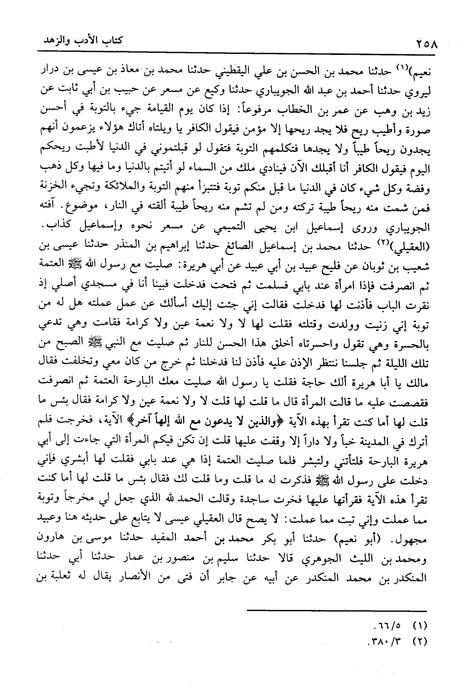 (العُقَيْليّ) حَدَّثَنَا مُحَمَّد بْن إِسْمَاعِيل الصَّائِغ حَدَّثَنَا إِبْرَاهِيم بْن الْمُنْذر حَدَّثَنَا عِيسَى بْن شُعَيْب بْن ثَوْبَان عَنْ فليح عُبَيْد بْن أَبِي عُبَيْد عَنْ أَبِي هُرَيْرَةَ: صَلَّيْتُ مَعَ رَسُولِ الله الْعَتَمَةَ ثُمَّ انْصَرَفْتُ فَإِذَا امْرَأَةٌ عِنْدَ بَابِي فَسَلَّمْتُ ثُمَّ فَتَحْتُ فَدَخَلْتُ فَبَيْنَا أَنَا فِي مَسْجِدِي أُصَلِّي إِذْ نَقَرَتِ الْبَابَ فَأَذِنْتُ لَهَا فَدخلت فَقَالَت إِنِّي جِئْتُ إِلَيْكَ أَسْأَلُكَ عَنْ عَمَلٍ عَمِلْتُهُ هَلْ لَهُ مِنْ تَوْبَةٍ إِنِّي زَنَيْتُ وَوَلَدْتُ وَقَتَلْتُهُ فَقُلْتُ لَهَا لَا وَلا نُعْمَةَ عَيْنٍ وَلا كَرَامَةَ فَقَامَتْ وَهِيَ تَدْعى بِالْحَسْرَةِ وَهِيَ تَقُولُ وَاحَسْرَتَاهُ أَخُلِقَ هَذَا الْحُسْنُ لِلنَّارِ ثُمَّ صَلَّيْتُ مَعَ النَّبِي الصُّبْحَ مِنْ تِلْكَ اللَّيْلَةِ ثُمَّ جَلَسْنَا نَنْتَظِرُ الإِذْنَ عَلَيْهِ فَأَذِنَ لَنَا فَدَخَلْنَا ثُمَّ خَرَجَ مَنْ كَانَ معي وَتَخَلَّفت فَقَالَ مَالك يَا أَبَا هُرَيْرَةَ أَلَكَ حَاجَةٌ فَقُلْتُ يَا رَسُولَ اللَّهِ صَلَّيْتُ مَعَكَ الْبَارِحَةَ الْعَتَمَةَ ثُمَّ انْصَرَفْتُ فَقَصَصْتُ عَلَيْهِ مَا قَالَتِ الْمَرْأَةُ قَالَ مَا قُلْتَ لَهَا قُلْتُ لَا وَلا نُعْمَةَ عَيْنٍ وَلا كَرَامَةَ فَقَالَ بِئْسَ مَا قُلْتَ لَهَا أما كنت تقْرَأ بِهَذِهِ الآيَةَ {وَالَّذِينَ لَا يَدْعُونَ مَعَ الله إِلَهًا آخر} الآيَةَ، فَخَرَجْتُ فَلَمْ أَتْرُكْ فِي الْمَدِينَةِ خَبًّا وَلا دَارًا إِلا وقفت عَلَيْهَا قلت إِنْ تَكُنْ فِيكُمُ الْمَرْأَةُ الَّتِي جَاءَتْ إِلَى أَبِي هُرَيْرَةَ الْبَارِحَةَ فَلْتَأْتِنِي وَلِتُبْشِرْ فَلَمَّا صَلَّيْتُ الْعَتَمَةَ إِذَا هِيَ عِنْدَ بَابِي فَقُلْتُ لَهَا أَبْشِرِي فَإِنِّي دَخَلْتُ عَلَى رَسُول الله فَذَكَرْتُ لَهُ مَا قُلْتِ وَمَا قلت لَك فَقَالَ بئْسَمَا قُلْتَ لَهَا أَمَا كُنْتَ تَقْرَأُ هَذِهِ الآيَةَ فَقَرَأْتُهَا عَلَيْهَا فَخَرَّتْ سَاجِدَةً وَقَالَتِ الْحَمْدُ لِلَّهِ الَّذِي جَعَلَ لِي مَخْرَجًا وَتَوْبَةً مِمَّا عَمِلْتُ وَإِنِّي تُبْتُ مِمَّا عَمِلْتُ: لَا يَصِّح قَالَ العُقَيْليّ عِيسَى لَا يُتَابع على حَدِيثه هُنَا وَعبيد مَجْهُول.