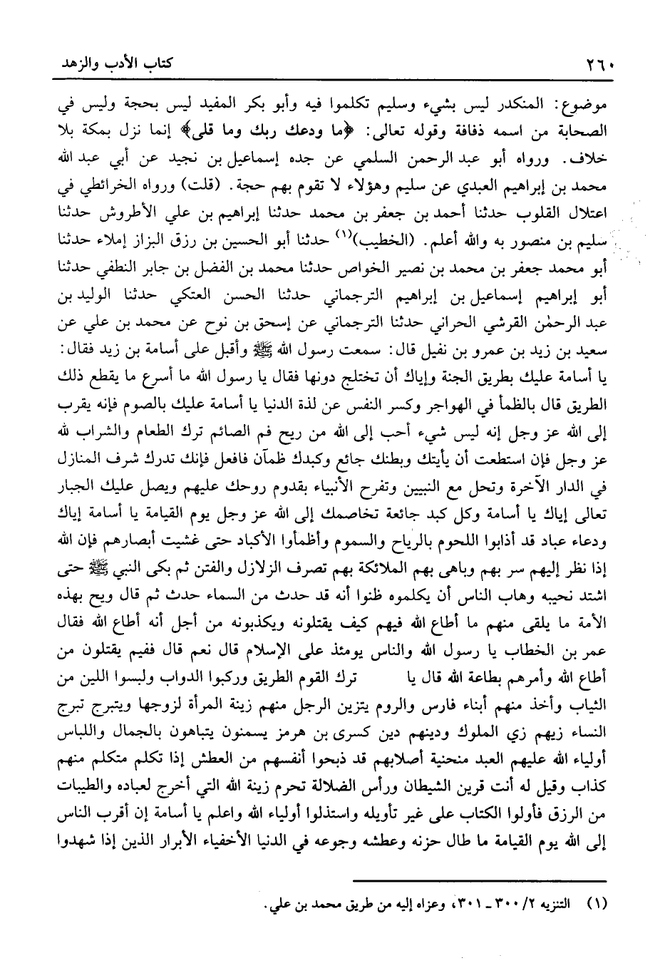 (الْخَطِيب) حَدَّثَنَا أَبُو الْحُسَيْن بْن رزق الْبَزَّاز إملاء حَدَّثَنَا أَبُو مُحَمَّد جَعْفَر بْن مُحَمَّد بْن نصير الْخَواص حَدَّثَنَا مُحَمَّد بْن الْفَضْل بْن جَابِر النطفي حَدَّثَنَا أَبُو إِبْرَاهِيم إِسْمَاعِيل بْن إِبْرَاهِيم الترجماني حَدَّثَنَا الْحَسَن الْعَتكِي حَدَّثَنَا الْوَلِيد بْن عَبْد الرَّحْمَن الْقُرَشِيّ الحرَّاني حَدَّثَنَا الترجماني عَنْ إِسْحَاق بْن نوح عَنْ مُحَمَّد بْن عَلِيّ عَنْ سَعِيد بْن زَيْد بْن عَمْرو بْن نفَيْل قَالَ: سَمِعْتُ رَسُول الله وَأَقْبل عَلَى أُسَامَة بْن زَيْد فَقَالَ: يَا أُسَامَة عَلَيْك بطرِيق الجَنَّة وَإِيَّاك أَن تختلج دونهَا فَقَالَ يَا رَسُول اللَّه مَا أسْرع مَا يقطع ذَلِكَ الطَّرِيق قَالَ بالظمأ فِي الهواجر وَكسر النَّفْس عَنْ لَذَّة الدُّنْيَا يَا أُسَامَة عَلَيْك بِالصَّوْمِ فَإنَّهُ يقرب إِلَى اللَّه عَزَّ وَجَلّ إنَّه لَيْسَ شَيْء أحبّ إِلَى اللَّه منْ ريح فَم الصَّائِم ترك الطَّعَام وَالشرَاب للَّه عَزَّ وَجَلّ فَإِن اسْتَطَعْت أَن يَأْتِيك وبطنك جَائِع وكبدك ظمآن فافعل فَإنَّك تدْرك شرف الْمنَازل فِي الدَّار الْآخِرَة وَتحل مَعَ النَّبِيين وتفرح الْأَنْبِيَاء بقدوم روحك عَلَيْهِم وَيُصلي عَلَيْك الْجَبَّار تَعَالَى إياك يَا أُسَامَة وكل كبد جَائِع تخاصمك إِلَى اللَّه عَزَّ وَجَلّ يَوْم الْقِيَامَة يَا أُسَامَة إياك وَدُعَاء عباد قَدْ أذابوا اللحوم بالرياح والسموم وأظمأوا الأكباد حَتَّى غشيت أَبْصَارهم فَإِن اللَّه إِذا نظر إِلَيْهِم سر بهم وباهى بهم الْمَلَائِكَة بهم تصرف الزلازل والفتن ثُمّ بَكَى النَّبِيّ حَتَّى اشْتَدَّ نحيبه وهاب النّاس أَن يكلموه ظنُّوا أَنَّهُ قَدْ حدَّث مِنَ السَّمَاء حدَّث ثُمّ قَالَ وَيْح بِهَذِهِ الْأمة مَا يلقى مِنْهُم مَا أطَاع اللَّه فيهم كَيفَ يقتلونه ويكذبونه مِنَ اجل أَنَّهُ أطَاع اللَّه فَقَالَ عُمَر بْن الخَطَّاب يَا رَسُول اللَّه وَالنَّاس يَوْمئِذٍ عَلَى الْإِسْلَام قَالَ نعم قَالَ فَفِيمَ يقتلُون منْ أطَاع اللَّه وَأمرهمْ بِطَاعَة اللَّه قَالَ يَا عُمَر ترك الْقَوْم الطَّرِيق وركبوا الدَّوَابّ ولبسوا اللين مِنَ الثِّيَاب وَأخذ مِنْهُم أَبنَاء فَارس وَالروم يتزين الرجل مِنْهُم زِينَة الْمَرْأَة لزَوجهَا ويتبرج تبرج النّساء زيهم زِيّ الْمُلُوك وَدينهمْ دين كسْرَى بْن هُرْمُز يسمنون يتباهون بالجمال واللباس أَوْلِيَاء الله عَلَيْهِم العَبْد منحنية أصلابهم قَدْ ذَبَحُوا أنفسهم مِنَ الْعَطش إِذا تكلم مُتَكَلم مِنْهُم كَذَّاب وَقيل لَهُ أَنْت قرين الشَّيْطَان وَرَأس الضَّلَالَة تحرم زِينَة اللَّه الَّتِي أخرج لِعِبَادِهِ والطيبات مِنَ الرزق فأولوا الْكتاب عَلَى غَيْر تَأْوِيله واستذلوا أَوْلِيَاء اللَّه وَاعْلَم يَا أُسَامَة إِن أقرب النّاس إِلَى الله يَوْم الْقِيَامَة مَا طَال حزنه وعطشه وجوعه فِي الدُّنْيَا الأخفياء الْأَبْرَار الَّذين إِذا شهدُوا