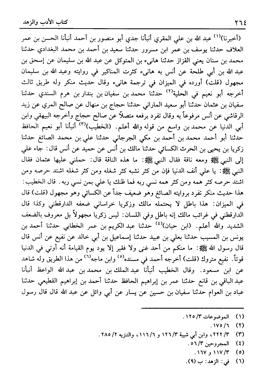 (الْخَطِيب) أَنْبَأنَا أَبُو نُعَيْم الْحَافِظ حَدَّثَنَا أَبُو أَحْمَد مُحَمَّد بْن أَحْمَد بْن مكّيّ الْجِرْجَانِيّ حَدَّثَنَا عَلِيّ بْن مُحَمَّد الصَّائِغ حَدَّثَنَا زَكَرِيّا بْن يَحْيَى بْن الْحَرْث الْكسَائي حَدَّثَنَا مَالك بْن أنس عَن حُمَيد عَنْ أَنَسٍ قَالَ: جَاءَ عَليّ إِلَى النَّبِي وَمَعَهُ نَاقَة فَقَالَ النَّبِي: مَا هَذِهِ النَّاقَةُ قَالَ: حَمَلَنِي عَلَيْهَا عُثْمَان فَقَالَ النَّبِي: يَا عَلِيُّ أنف الدُّنْيَا فَإِنَّ مَنْ كَثُرَ نَشَبُهُ كَثُرَ شُغْلُهُ وَمَنْ كَثُرَ شُغْلُهُ أشْتَدَّ حِرْصُهُ وَمَنِ أشْتَدَّ حِرْصُهُ كَثُرَ هَمُّهُ وَمَنْ كَثُرَ هَمُّهُ نَسِيَ رَبَّهُ فَمَا ظَنُّكَ يَا عَلِيُّ بِمَنْ نَسِيَ رَبَّهُ.
