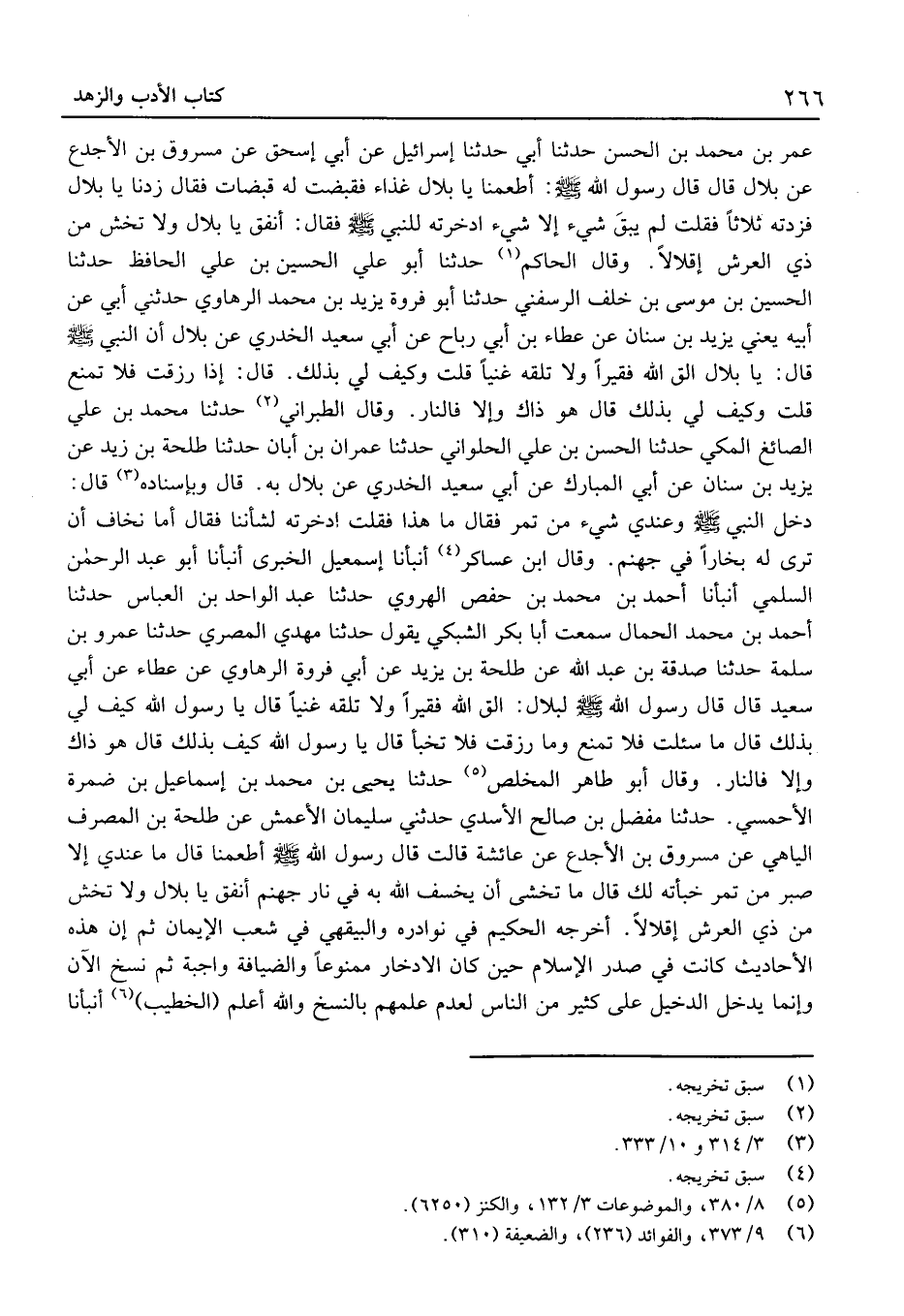 عُمَر بْن مُحَمَّد بْن الْحَسَن حَدَّثَنَا أَبِي حَدَّثَنَا إِسْرَائِيل عَنْ أَبِي إِسْحَاق عَنْ مَسْرُوق بْن الأجدع عَنْ بِلالٍ قَالَ قَالَ رَسُول الله: أَطْعِمْنَا يَا بِلالُ غِذَاءً فَقَبَضْتُ لَهُ قَبْضَاتٍ فَقَالَ زِدْنَا يَا بِلالُ فَزِدْتُهُ ثَلاثًا فَقُلْتُ لَمْ يَبْقَ شَيْءٌ إِلا شَيْءٌ ادَّخَرْتُهُ للنَّبِي فَقَالَ: أَنْفِقْ يَا بِلالُ وَلا تخش منْ ذِي الْعَرْش إقلالا.