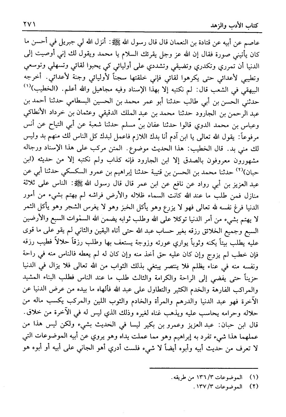 الْمَتْن مركب عَلَى هَذَا الْإِسْنَاد وَرِجَاله مَشْهُورُونَ معروفون بِالصّدقِ إِلَّا ابْن الْجَارُود فَإنَّهُ كَذَّاب وَلم نَكْتُبهُ إِلَّا منْ حَدِيثه (ابْن حَبَّان) حَدَّثَنَا مُحَمَّد بْن الْحَسَن بْن قُتَيْبَة حَدَّثَنَا إِبْرَاهِيم بْن عَمْرو السَّكْسكيّ حَدَّثَنَا أَبِي عَنْ عَبْد الْعَزِيز بْن أَبِي رواد عَن نَافِع عَنِ ابْنِ عُمَرَ قَالَ قَالَ رَسُول الله: النَّاسُ عَلَى ثَلاثَةِ مَنَازِلَ فَمَنْ طَلَبَ مَا عِنْدَ اللَّهِ كَانَتِ السَّمَاءُ ظِلالَهُ وَالأَرْضُ فِرَاشَهُ لَمْ يَهْتَمَّ بشَيْءٍ مِنْ أُمُورِ الدُّنْيَا فَرَّغَ نَفْسَهُ لِلَّهِ تَعَالَى فَهُوَ لَا يَزْرَعُ وَهُوَ يَأْكُلُ الْخُبْزَ وَهُوَ لَا يَغْرِسُ الشَّجَرَ وَهُوَ يَأْكُلُ الثَّمَرَ لَا يَهْتَمُّ بِشَيْءٍ مِنْ أَمْرِ الدُّنْيَا تَوَكُّلا عَلَى اللَّهِ وَطَلَبَ ثَوَابِهِ يُضَمِّنُ اللَّهُ السَّمَوَات السَّبْعَ وَالأَرَضِينَ السَّبْعَ وَجَمِيعَ الْخَلائِقِ رِزْقَهُ بِغَيْرِ حِسَابٍ عَبَدَ اللَّهَ حَتَّى أَتَاهُ الْيَقِينُ وَالثَّانِي لَمْ يَقْوَ عَلَى مَا قَوِيَ عَلَيْهِ فطيب بَيْتًا يُكِنُّهُ وَثَوْبًا يُوَارِي عَوْرَتَهُ وَزَوْجَةً يَسْتَعِفُّ بِهَا وَطَلَبَ رِزْقًا حَلَالا يطيب رِزْقَهُ فَإِنْ خَطَبَ لَمْ يُزَوَّجْ وَإِنْ كَانَ عَلَيْهِ حَقٌّ أُخِذَ مِنْهُ وَإِنْ كَانَ لَهُ لَمْ يُعْطَهُ فَالنَّاسُ مِنْهُ فِي رَاحَةٍ وَنَفْسُهُ مِنْهُ فِي عَنَاءٍ يُظْلَمُ فَلا يَنْتَصِرُ يَبْتَغِي بِذَلِكَ الثَّوَابَ مِنَ اللَّهِ تَعَالَى فَلا يَزَالُ فِي الدُّنْيَا حَزِينًا حَتَّى يُفْضِي إِلَى الرَّاحَةِ وَالْكَرَامَةِ وَالثَّالِثُ طَلَبَ مَا عِنْدَ النَّاسِ فَطَلَبَ الْبِنَاءَ المشيد والمراكب الفارهة والخدم الْكثير والتطاول على عبد اللَّهِ فَأَلْهَاهُ مَا بِيَدِهِ مِنْ عَرَضِ الدُّنْيَا عَنِ الآخِرَةِ فَهُوَ عَبْدُ الدُّنْيَا وَالدِّرْهَمِ وَالْمَرْأَةِ وَالْخَادِمِ وَالثَّوْبِ اللَّيِّنِ وَالْمَرْكَبِ يَكْسِبُ مَالَهُ مِنْ حَلالِهِ وَحَرَامِهِ يُحَاسَبُ عَلَيْهِ وَيَذْهَبُ غِنَاهُ لِغَيْرِهِ وَذَلِكَ الَّذِي لَيْسَ لَهُ فِي الآخِرَةِ مِنْ خَلاقٍ.