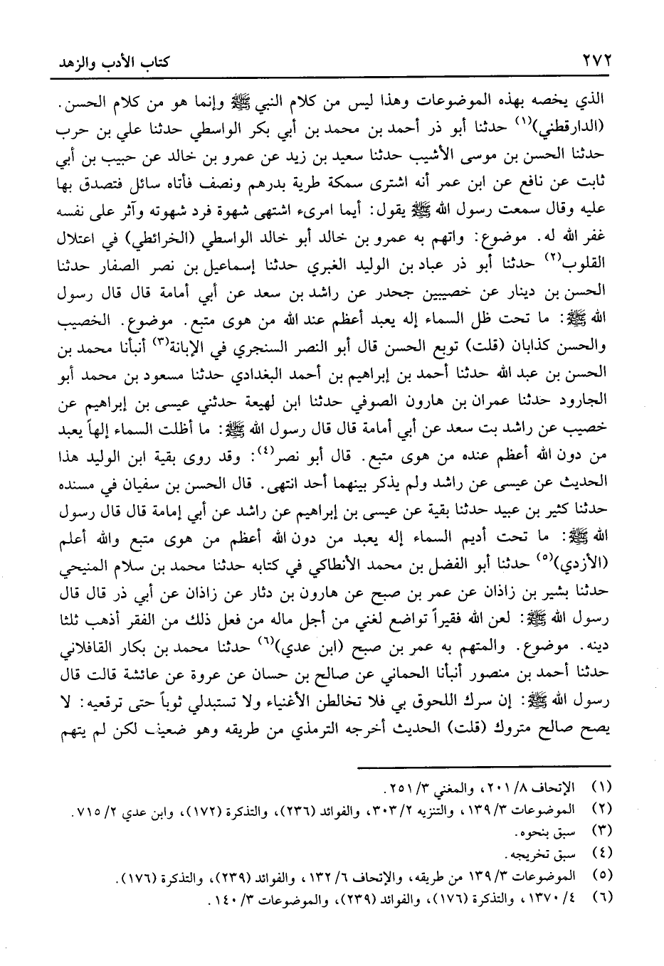 قَالَ الْحَسَن بْن سُفْيَان فِي مُسْنده حَدَّثَنَا كثير بْن عُبَيْد حَدَّثَنَا بَقِيَّة عَن عِيسَى بْن إِبْرَاهِيم عَنْ رَاشد عَن أَبِي أُمَامَةَ قَالَ قَالَ رَسُول الله: مَا تَحْتَ أَدِيمِ السَّمَاءِ إِلَهٌ يُعْبَدُ مِنْ دُونِ اللَّهِ أَعْظَمَ مِنْ هَوًى مُتَّبَعٌ واللَّه أَعْلَم (الْأَزْدِيّ) حَدَّثَنَا أَبُو الْفَضْل بْن مُحَمَّد الْأَنْطَاكِي فِي كِتَابه حَدَّثَنَا مُحَمَّد بن سَلام المليحي حَدَّثَنَا بِشير بْن زَاذَان عَنْ عُمَر بْن صبح عَنْ هَارُون بْن دثار عَنْ زَاذَان عَنْ أَبِي ذَرٍّ قَالَ قَالَ رَسُولُ الله: لَعَنَ اللَّهُ فَقِيرًا تَوَاضَعَ لِغَنِيٍّ مِنْ أَجْلِ مَالِهِ مَنْ فَعَلَ ذَلِكَ مِنَ الْفَقْرِ أُذْهِبَ ثُلُثَا دِينِهِ.