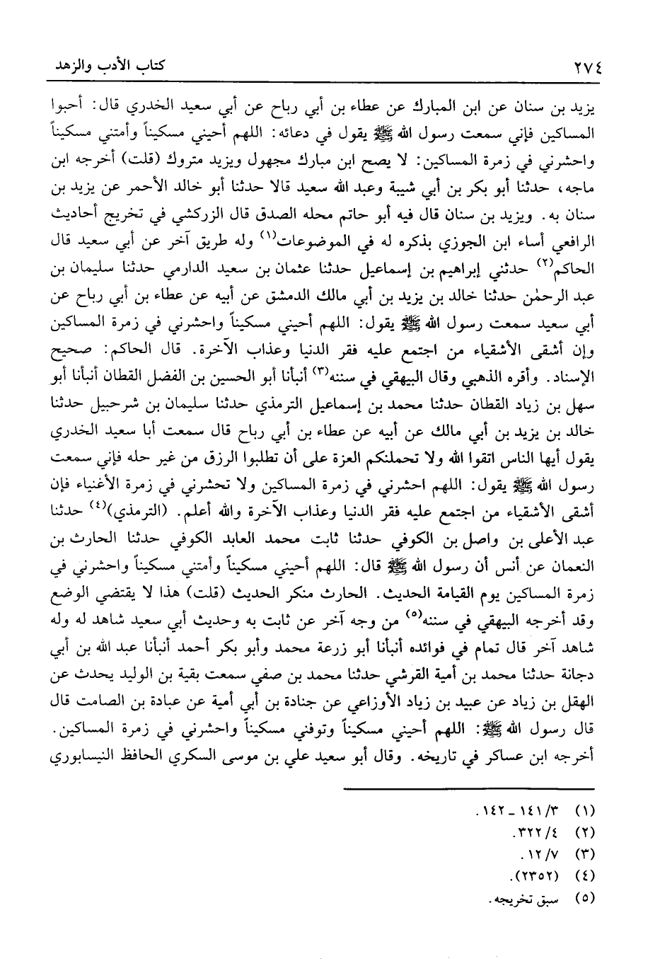(التِّرمِذيّ) حَدَّثَنَا عَبْد الْأَعْلَى بْن وَاصل بْن الْكُوفِي حَدَّثَنَا ثَابِت مُحَمَّد العابد الْكُوفِي حَدَّثَنَا الْحَارِث بْن النُّعْمَان عَن أَنَسٍ أَنّ رَسُولَ اللَّهِ قَالَ: اللَّهُمَّ أَحْيِنِي مِسْكِينًا وَأَمِتْنِي مِسْكِينًا وَاحْشُرْنِي فِي زُمْرَةِ الْمَسَاكِينِ يَوْمَ الْقِيَامَةِ الْحَدِيث.
