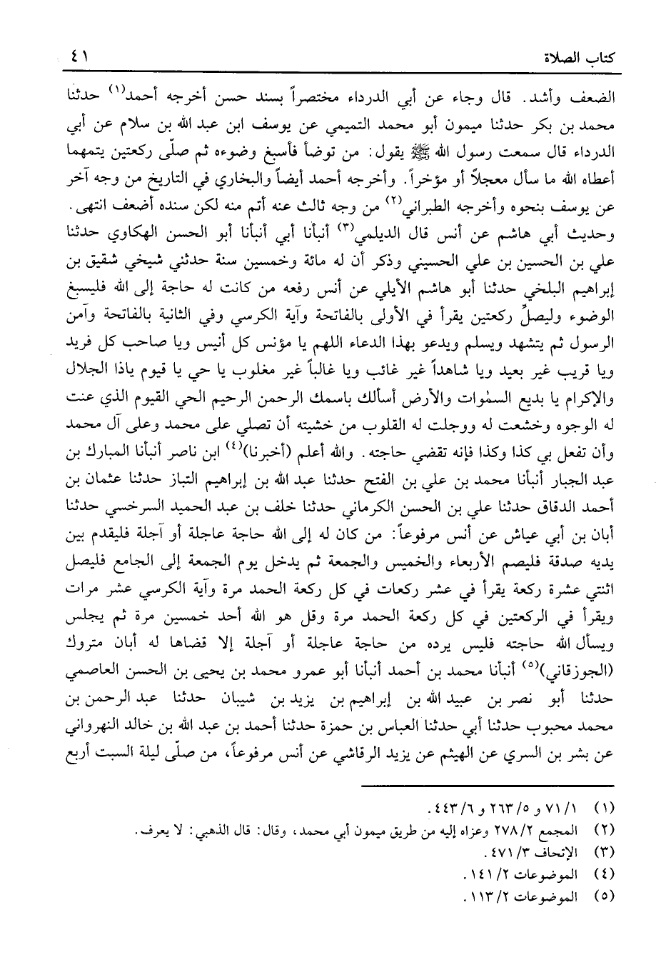 واللَّه أَعْلَم (أَخْبَرَنَا) ابْن نَاصِر أَنْبَأنَا الْمُبَارك بْن عَبْد الْجَبَّار أَنْبَأَنَا مُحَمَّد بْن عَلِيّ بْن الْفَتْح حَدَّثَنَا عَبْد اللَّه بن إِبْرَاهِيم التباز حَدَّثَنَا عُثْمَان بْن أَحْمَد الدقاق حَدَّثَنَا عَلِيّ بْن الْحَسَن الْكرْمَانِي حَدَّثَنَا خَلَف بْن عبد الحميد السَّرْخَسِيّ حَدَّثَنَا أبان بْن أَبِي عَيَّاش عَنْ أَنَس مَرْفُوعًا: مَنْ كَانَ لَهُ إِلَى الله حَاجَة عَاجِلَةٌ أَوْ آجِلَةٌ فَلْيُقَدِّمْ بَيْنَ يَدَيْهِ صَدَقَةً فَلْيَصُمِ الأَرْبِعَاءَ وَالْخَمِيسَ وَالْجُمُعَةَ ثُمَّ يَدْخُلُ يَوْمَ الْجُمُعَةِ إِلَى الْجَامِعِ فَلْيُصَلِّ اثْنَتَيْ عَشْرَةَ رَكْعَةً يَقْرَأُ فِي عَشْرِ رَكَعَاتٍ فِي كُلِّ رَكْعَةٍ الْحَمْدُ مَرَّةً وَآيَةَ الْكُرْسِيِّ عَشْرَ مَرَّاتٍ وَيَقْرَأُ فِي الرَّكْعَتَيْنِ فِي كُلِّ رَكْعَةٍ الْحَمْدُ مَرَّةً و {َقُلْ هُوَ اللَّهُ أَحَدٌ} خَمْسِينَ مَرَّةً ثُمَّ يَجْلِسُ وَيَسْأَلُ اللَّهَ حَاجَتَهُ فَلَيْسَ يَرُدُّهُ مِنْ حَاجَةٍ عَاجِلَةٍ أَوْ آجِلَةٍ إِلا قَضَاهَا لَهُ أبان مَتْرُوك (الجوزقاني) أَنْبَأَنَا مُحَمَّد بْن أَحْمَد أَنْبَأَنَا أَبُو عَمْرو مُحَمَّد بْن يَحْيَى بْن الْحَسَن العاصمي حَدَّثَنَا أَبُو نصر بْن عُبَيْد اللَّه بْن إِبْرَاهِيم بْن يَزِيد بْن شَيْبَان حَدَّثَنَا عَبْد الرَّحْمَن بن مُحَمَّد مَحْبُوب حَدَّثَنَا أَبِي حَدَّثَنَا الْعَبَّاس بْن حَمْزَة حَدَّثَنَا أَحْمَد بْن عَبْد اللَّه بْن خَالِد النهرواني عَنْ بشر بْن السّري عَنِ الْهَيْثَم عَنْ يَزِيد الرِّقاشي عَنْ أَنَس مَرْفُوعًا، مَنْ صَلَّى لَيْلَةَ السبت أَربع