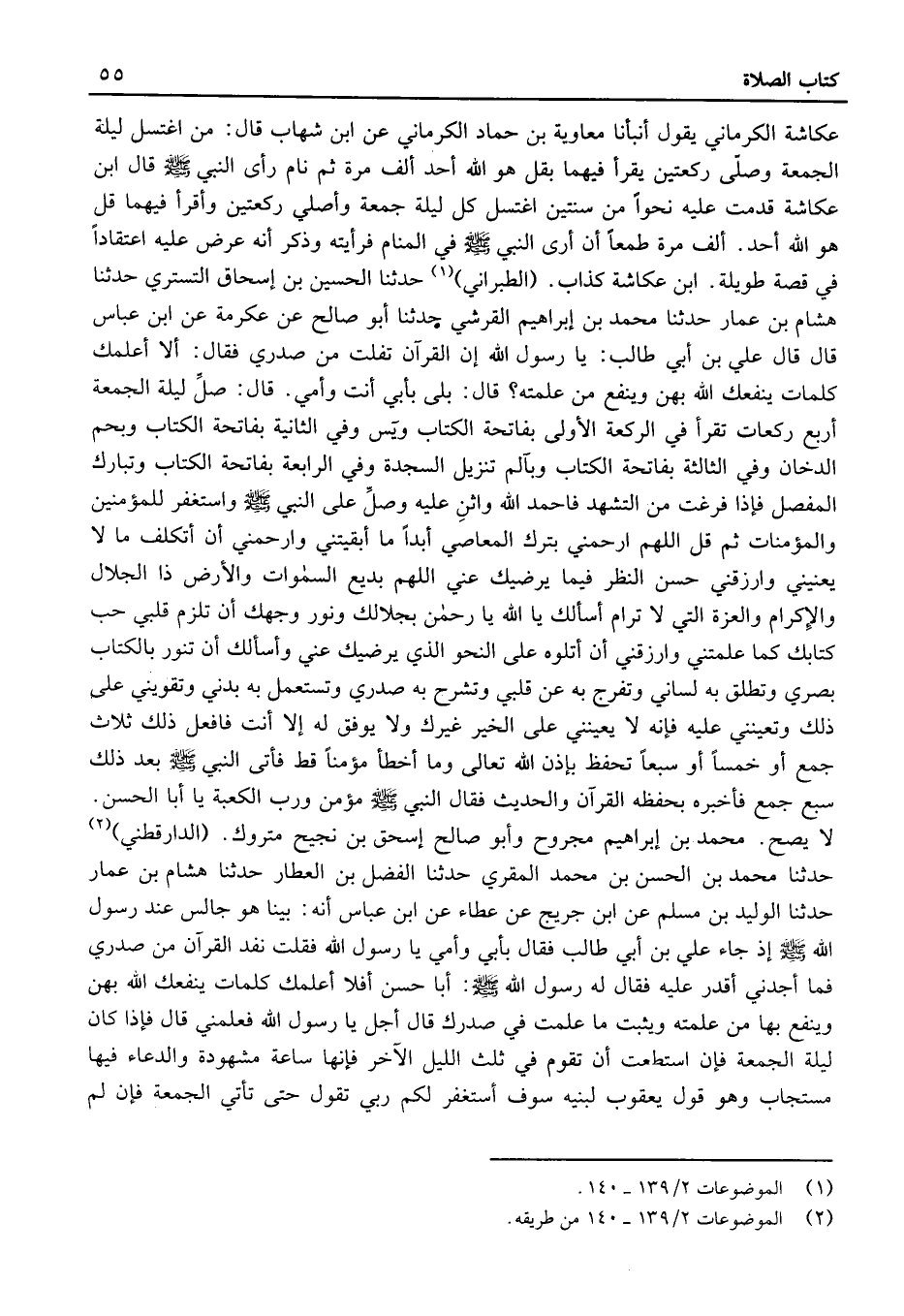 (الدارَقُطْنيّ) حَدَّثَنَا مُحَمَّد بْن الْحَسَن بْن مُحَمَّد الْمقري حَدثنَا الْفضل بن العَطَّار حَدَّثَنَا هِشَام بْن عمار حَدَّثَنَا الْوَلِيد بْن مُسْلِم عَن ابْن جريج عَن عَطاء عَن ابْنِ عَبَّاسٍ أَنَّهُ: بَيْنَا هُوَ جَالس عِنْد رَسُول الله إِذْ جَاءَ عَلِيُّ بْنُ أَبِي طَالِبٍ فَقَالَ بِأَبِي وَأُمِّي يَا رَسُولَ اللَّهِ فَقُلْتُ نَفِدَ الْقُرْآنُ مِنْ صَدْرِي فَمَا أَجِدُنِي أَقْدِرُ عَلَيْهِ فَقَالَ لَهُ رَسُولُ اللَّهِ: أَبَا حَسَنٍ أَفَلا أُعَلِّمُكَ كَلِمَاتٍ يَنْفَعُكَ اللَّهُ بِهِنَّ وَيَنْفَعُ بِهَا مَنْ عَلَّمْتَهُ وَيُثَبِّتُ مَا عَلِمْتَ فِي صَدْرِكَ قَالَ أَجَلْ يَا رَسُولَ اللَّهِ فَعَلِّمْنِي قَالَ فَإِذَا كَانَ لَيْلَةُ الْجُمُعَةِ فَإِنِ اسْتَطَعْتَ أَنْ تَقُومَ فِي ثُلُثِ اللَّيْلِ الآخَرِ فَإِنَّهَا سَاعَةٌ مَشْهُودَةٌ وَالدُّعَاءُ فِيهَا مُسْتَجَابٌ وَهُوَ قَوْلُ يَعْقُوبَ لِبَنِيهِ سَوْفَ أَسْتَغْفِرُ لَكُمْ رَبِّي تَقُول حَتَّى تَأْتِيَ الْجُمُعَةُ فَإِنْ لم