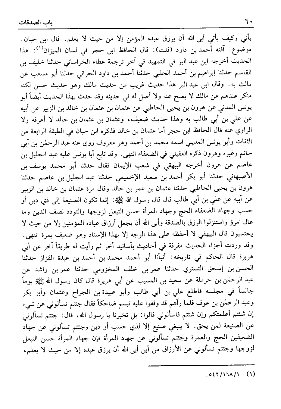 وَقَدْ تَابع أَبَا يُونُس عَلَيْهِ عَبْد الْجَلِيل بْن عَاصِم عَنْ هَارُون أَخْرَجَهُ البَيْهَقيّ فِي شعب الْإِيمَان فَقَالَ حَدَّثَنَا أَبُو مُحَمَّد يُوسُف بْن الْأَصْبَهَانِيّ حَدَّثَنَا أَبُو بَكْر أَحْمَد بْن سَعِيد الإخميمي حَدَّثَنَا عَبْد الْجَلِيل بْن عَاصِم حَدَّثَنَا هَارُون بْن يَحْيَى الْحَاطِبِيُّ حَدَّثَنَا عُثْمَان بْن عُمَرَ بْن خَالِد وقَالَ مرّة عُثْمَان بْن خَالِد بْن الزبير عَنْ أَبِيهِ عَن عَليّ بْن أَبِي طَالب قَالَ قَالَ رَسُول الله: إِنَّمَا تَكُونُ الصَّنِيعَةُ إِلَى ذِي دِينٍ أَوْ حَسَبٍ وَجِهَادُ الضُّعَفَاءِ الْحَجُّ وَجِهَادُ الْمَرْأَةِ حُسْنُ التَّبَعُّلِ لِزَوْجِهَا وَالتَّوَدُّدُ نِصْفُ الدِّينِ وَمَا عَال امْرُؤ وَاسْتَنْزِلُوا الرِّزْقَ بِالصَّدَقَةِ وَأَبَى اللَّهُ أَنْ يَجْعَلَ أَرْزَاقَ عِبَادِهِ الْمُؤْمِنِينَ إِلا مِنْ حَيْثُ لَا يَحْتَسِبُونَ قَالَ البَيْهَقيّ لَا أحفظه عَلَى هَذَا الْوَجْه إِلَّا بِهَذَا الْإِسْنَاد وَهُوَ ضَعِيف بِمرَّة انْتهى.