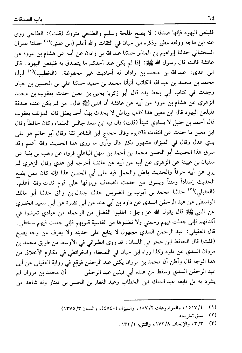 فَلْيَلْعَنِ الْيَهُودَ فَإِنَّهَا صَدَقَةٌ: لَا يَصح طَلْحَة وسُلَيْم والطلحي مَتْرُوك (قُلْتُ) : الطلحي رَوَى عَنْهُ ابْن مَاجَه وَوَثَّقَهُ مطير وَذكره ابْن حبَان فِي الثِّقَات وَالله أعلم (ابْن عَدِيّ) حَدَّثَنَا عِمْرَانَ السّخْتِيَانِيّ حَدَّثَنَا إِبْرَاهِيم بْن الْمُنْذر حَدَّثَنَا عَبْد اللَّه بْن زادان عَنْ أَبِيهِ عَن هِشَام بْن عُرْوَة عَن عَائِشَةَ قَالَتْ قَالَ رَسُولُ الله: إِذَا لَمْ يَكُنْ عِنْدَ أَحَدِكُمْ مَا يَتَصَدَّقُ بِهِ فَلْيَلْعَنِ الْيَهُودَ.