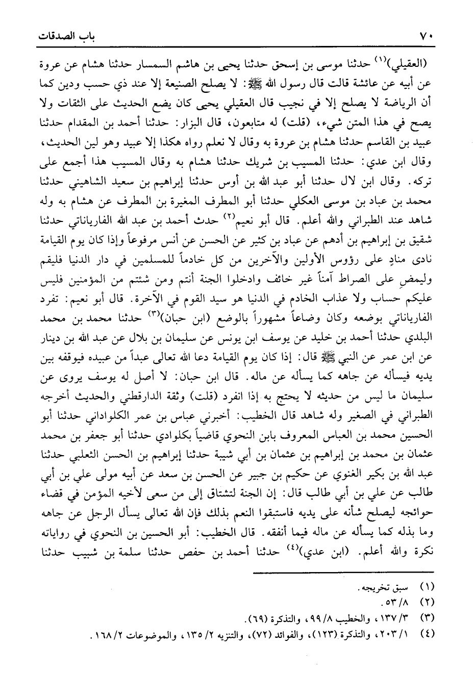 (العُقَيْليّ) حَدَّثَنَا مُوسَى بْن إِسْحَاق حَدَّثَنَا يَحْيَى بْن هَاشم السمسار حَدَّثَنَا هِشَام عَنْ عُرْوَة عَنْ أَبِيهِ عَن عَائِشَةَ قَالَتْ قَالَ رَسُول الله: لَا يَصْلُحُ الصَّنِيعَةُ إِلا عِنْدَ ذِي حَسَبٍ وَدِينٍ كَمَا أَن الرياضة لَا يصلح إِلَّا فِي نجيب قَالَ العُقَيْليّ يَحْيَى كَانَ يضع الْحَدِيث عَلَى الثِّقَات وَلَا يَصح فِي هَذَا الْمَتْن شَيْء، (قُلْتُ) لَهُ متابعون، قَالَ الْبَزَّار: حَدَّثَنَا أَحْمَد بْن الْمِقْدَام حَدَّثَنَا عُبَيْد بْن الْقَاسِم حَدَّثَنَا هِشَام بْن عُرْوَة بِهِ وقَالَ لَا نعلم رَوَاهُ هَكَذَا إِلَّا عُبَيْد وَهُوَ لين الْحَدِيث، وقَالَ ابْن عَدِيّ: حَدَّثَنَا المسيِّب بْن شريك حَدَّثَنَا هِشَام بِهِ وقَالَ المسيِّب هَذَا أجمع عَلَى تَركه.