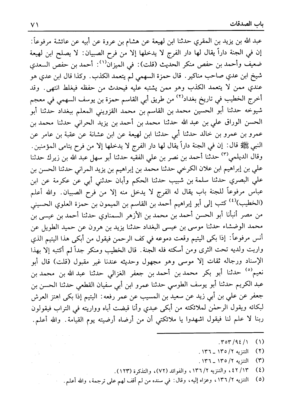 وَقد أخرج الْخَطِيب فِي تَارِيخ بَغْدَاد من طَرِيق أَبِي الْقَاسِم حَمْزَة بْن يُوسُف السَّهْمِي فِي مُعْجم شُيُوخه حَدَّثَنَا أَبُو الْحُسَيْن مُحَمَّد بْن الْقَاسِم بْن مُحَمَّد القَزْوينيّ الْمعلم بِبَغْدَاد حَدَّثَنَا أَبُو الْحَسَن الْوَرَّاق عَلِيّ بْن عَبْد الله حَدَّثَنَا مُحَمَّد بْن أَحْمَد بْن يَزِيد الحرَّاني حَدَّثَنَا مُحَمَّد بْن عَمْرو بْن عَمْرو بْن خَالِد حَدَّثَنَا أَبِي حَدَّثَنَا ابْن لَهِيعَة عَنِ ابْن عشانة عَنْ عُقْبَةَ بْنِ عَامِرٍ عَن النَّبِي قَالَ: إِنَّ فِي الْجَنَّةِ دَارًا يُقَالُ لَهَا دَارُ الْفَرَجِ لَا يَدْخُلُهَا إِلا مَنْ فَرَّحَ يَتَامَى الْمُؤْمِنِينَ.