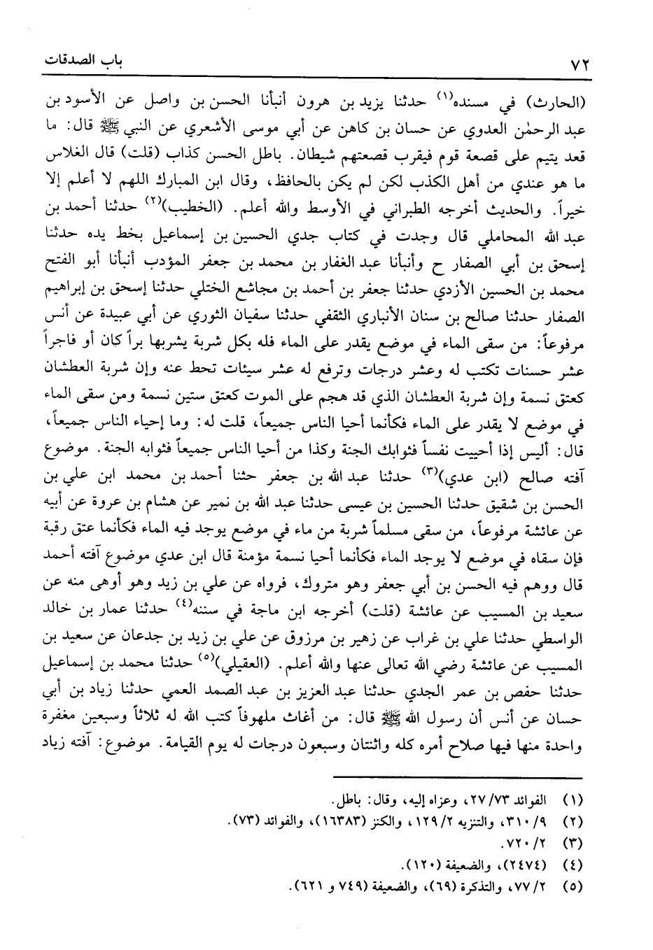مَوْضُوع آفته صَالح (ابْن عدي) حَدَّثَنَا عَبْد الله بْن جَعْفَر حَدَّثَنَا أَحْمَد بْن مُحَمَّد ابْن عَلِيّ بْن الْحَسَن بْن شَقِيق حَدَّثَنَا الْحُسَيْن بْن عِيسَى حَدَّثَنَا عَبْد اللَّه بْن نمير عَنْ هِشَام بْن عُرْوَة عَن أَبِيهِ عَنْ عَائِشَةَ مَرْفُوعًا، مَنْ سَقَى مُسلما شربة مَاءٍ فِي مَوْضِعٍ يُوجَدُ فِيهِ المَاء فَكَأَنَّمَا أعتق رَقَبَةً فَإِنْ سَقَاهُ فِي مَوْضِعٍ لَا يُوجَدُ الْمَاءُ فَكَأَنَّمَا أَحْيَا نَسَمَةً مُؤْمِنَةً قَالَ ابْن عَدِيّ مَوْضُوع آفته أَحْمَد قَالَ وَوهم فِيهِ الْحَسَن بْن أَبِي جَعْفَر وَهُوَ مَتْرُوك، فَرَوَاهُ عَنْ عَلِيّ بْن زَيْد وَهُوَ أَوْهَى مِنْهُ عَن سَعِيد بْن الْمسيب عَن عَائِشَة (قُلْتُ) أَخْرَجَهُ ابْن مَاجَه فِي سنَنه حَدَّثَنَا عمار بْن خَالِد الواسطيّ حَدَّثَنَا عَلِيّ بْن غراب عَنْ زُهَيْر بْن مَرْزُوق عَن عَلِيّ بْن زيد بْن جدعَان عَنْ سَعِيد بْن المسيِّب عَنْ عَائِشَة رَضِيَ اللَّه تَعَالَى عَنْهَا واللَّه أَعْلَم.
